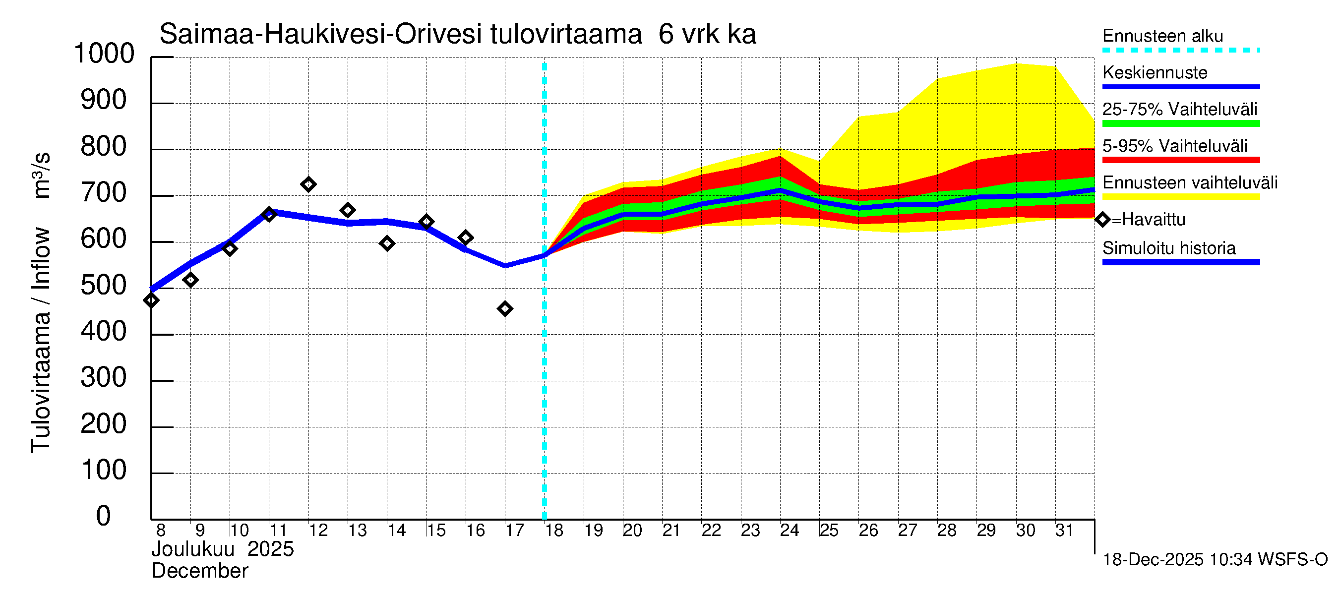 Vuoksen vesistöalue - Saimaa Lauritsala: Tulovirtaama (usean vuorokauden liukuva keskiarvo) - jakaumaennuste