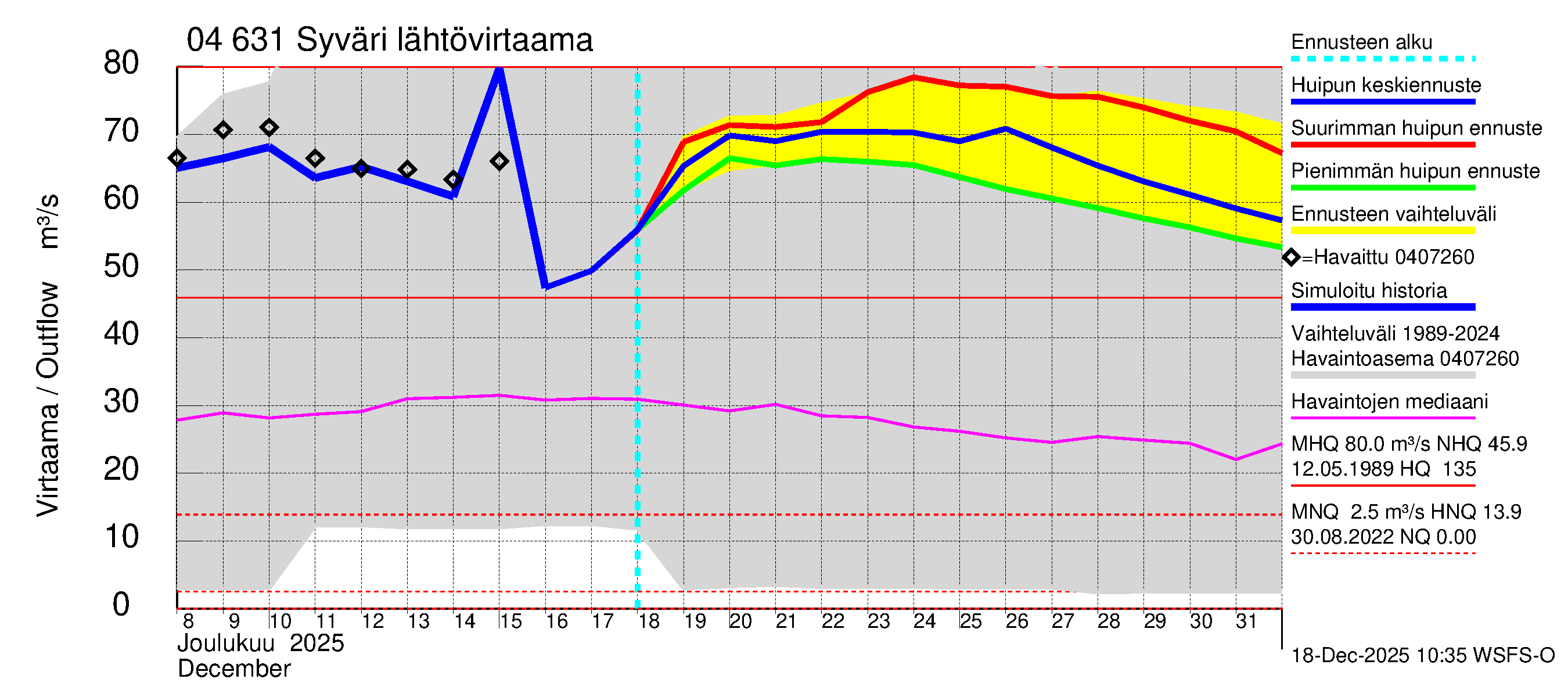 Vuoksen vesistöalue - Syväri: Lähtövirtaama / juoksutus - huippujen keski- ja ääriennusteet