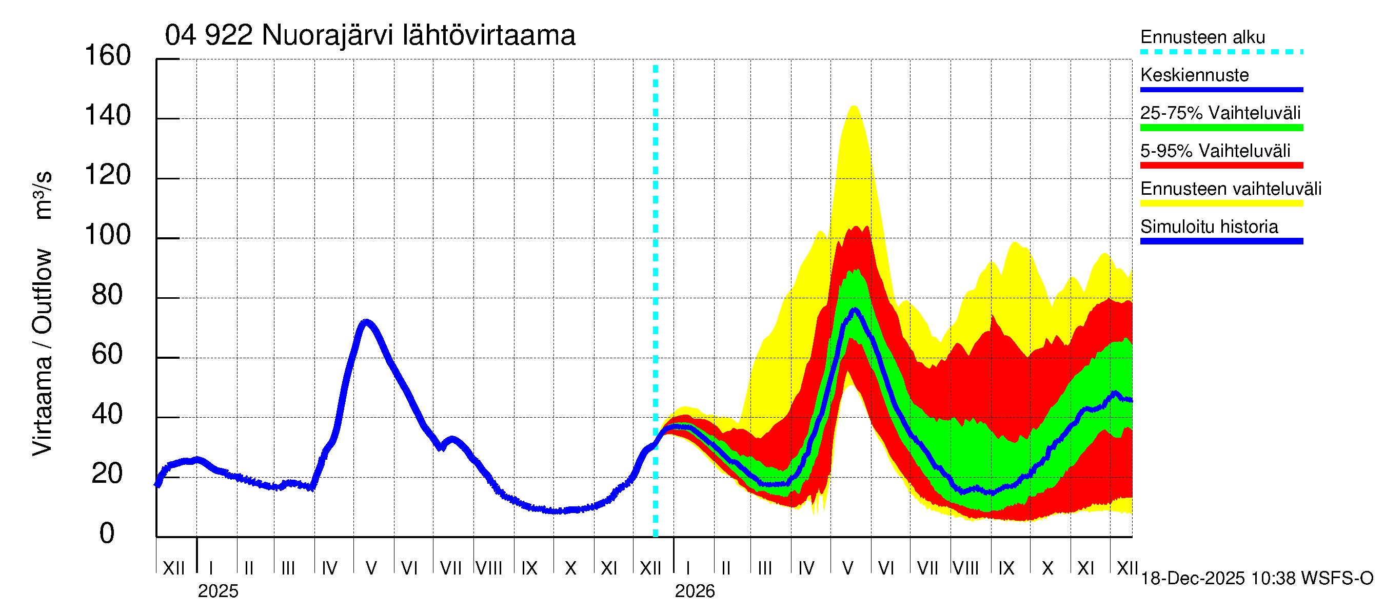 Vuoksen vesistöalue - Nuorajärvi: Lähtövirtaama / juoksutus - huippujen keski- ja ääriennusteet