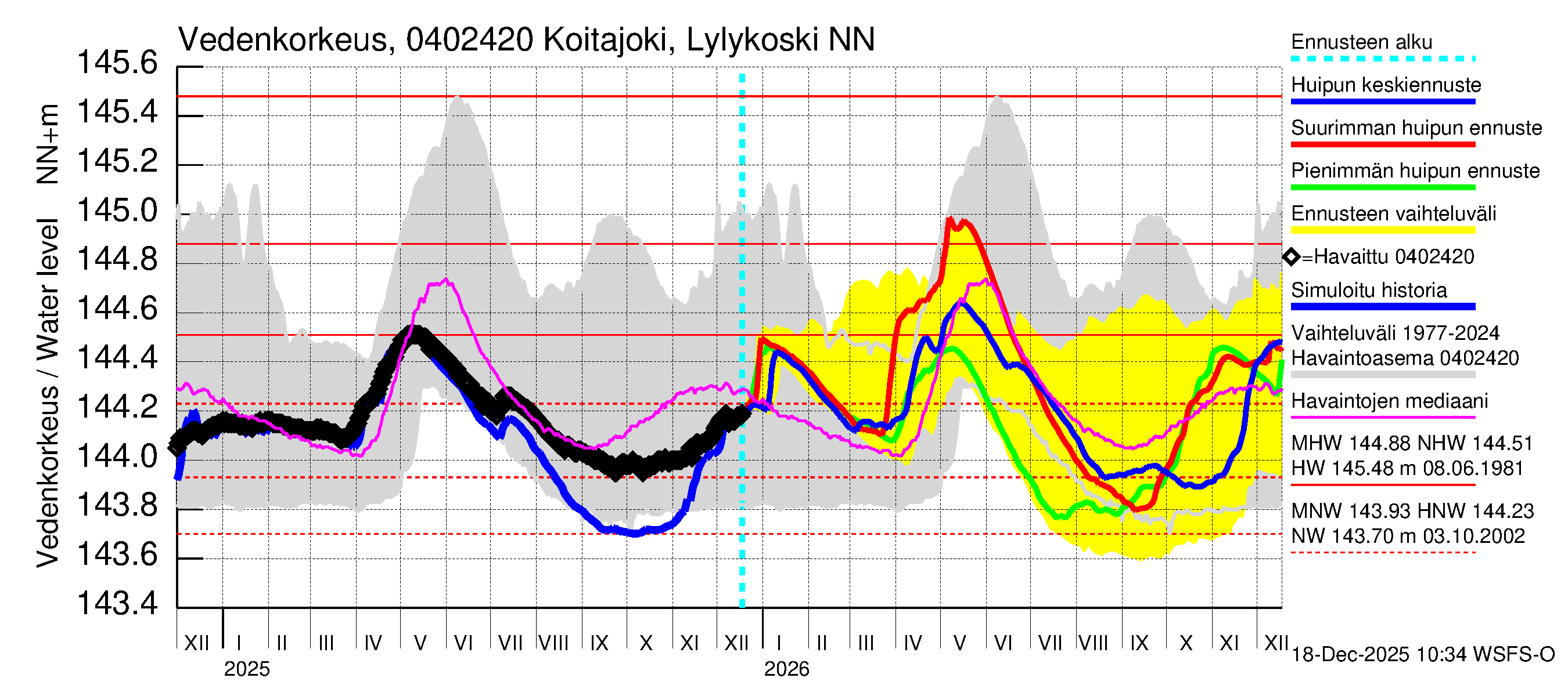 Vuoksen vesistöalue - Koitajoki Lylykoski: Vedenkorkeus - huippujen keski- ja ääriennusteet