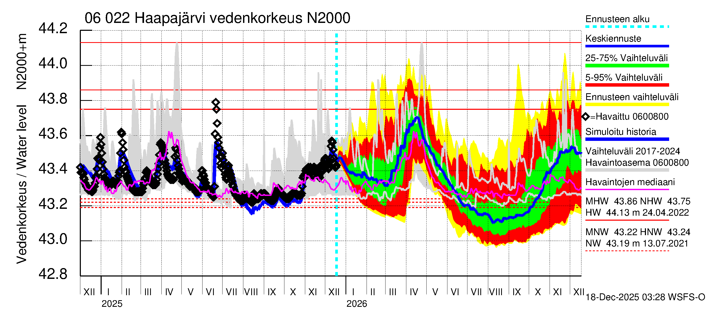 Hounijoen vesistöalue - Haapajärvi: Vedenkorkeus - huippujen keski- ja ääriennusteet