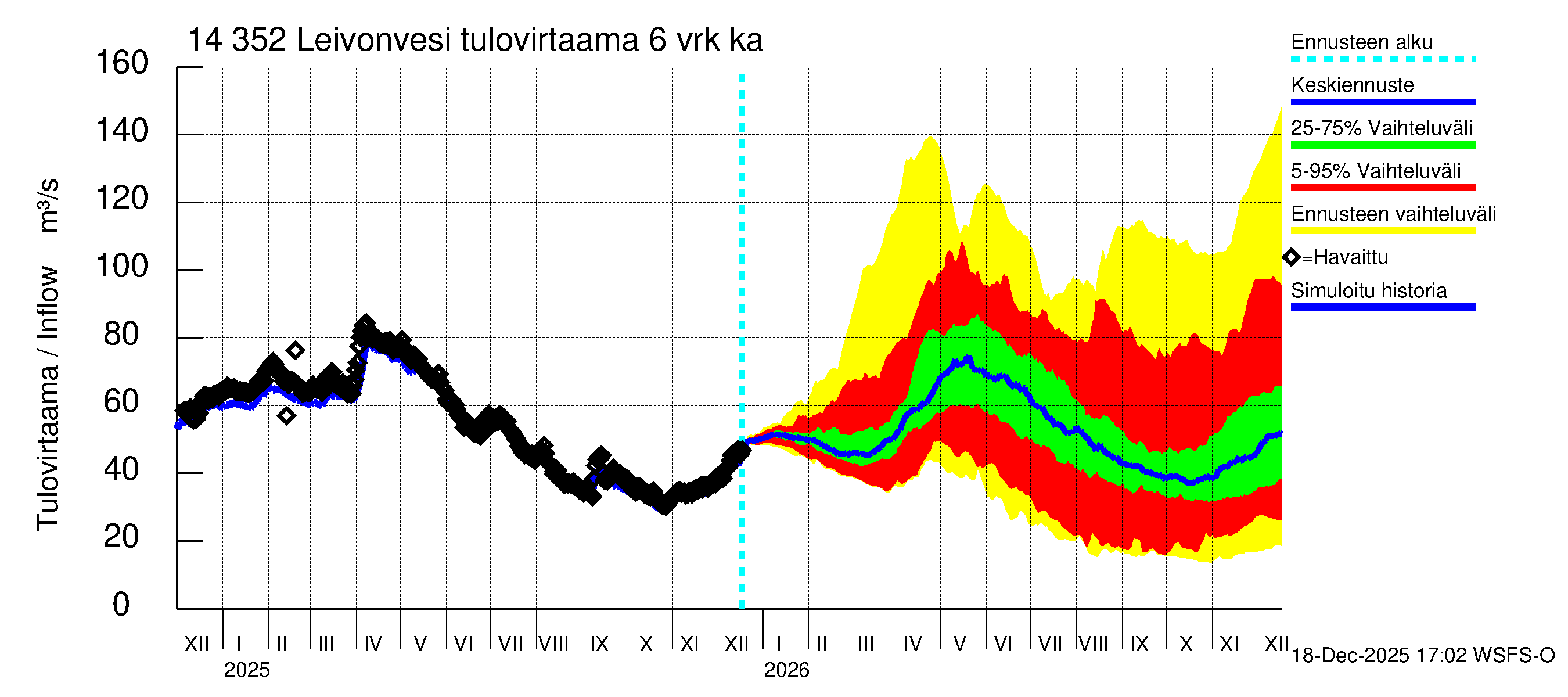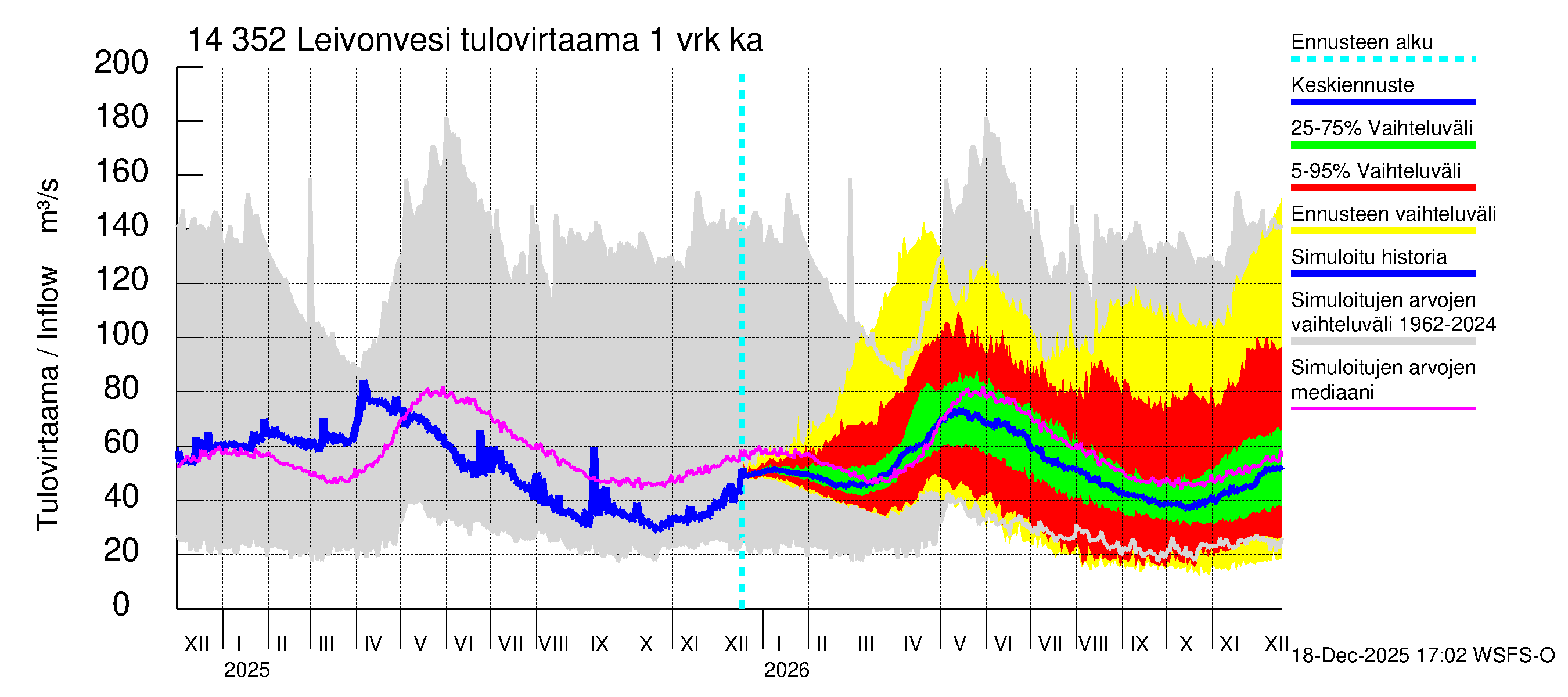 Kymijoen vesistöalue - Leivonvesi: Tulovirtaama (usean vuorokauden liukuva keskiarvo) - jakaumaennuste