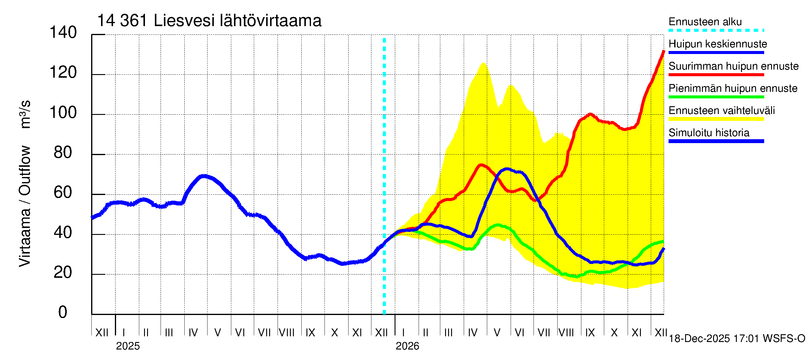Kymijoen vesistöalue - Liesvesi: Lähtövirtaama / juoksutus - huippujen keski- ja ääriennusteet