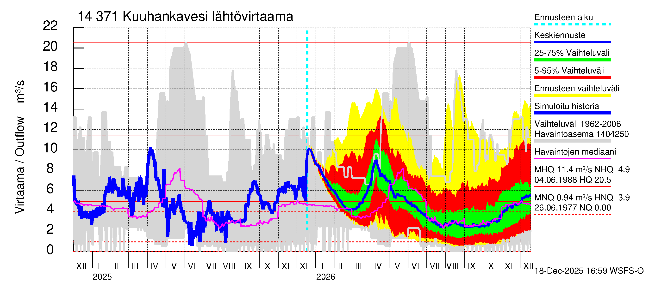 Kymijoen vesistöalue - Kuuhankavesi: Lähtövirtaama / juoksutus - huippujen keski- ja ääriennusteet