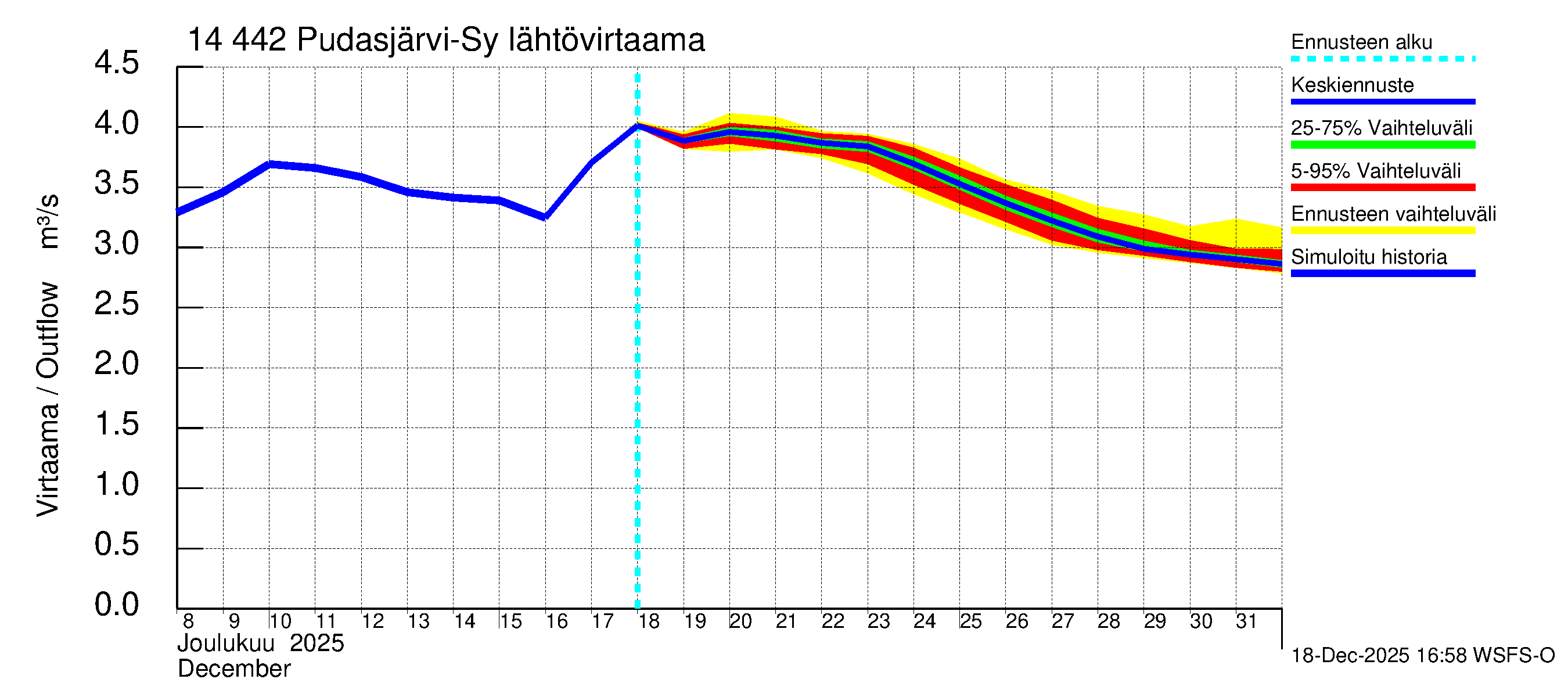 Kymijoen vesistöalue - Pudasjärvi-Syväjärvi: Lähtövirtaama / juoksutus - huippujen keski- ja ääriennusteet