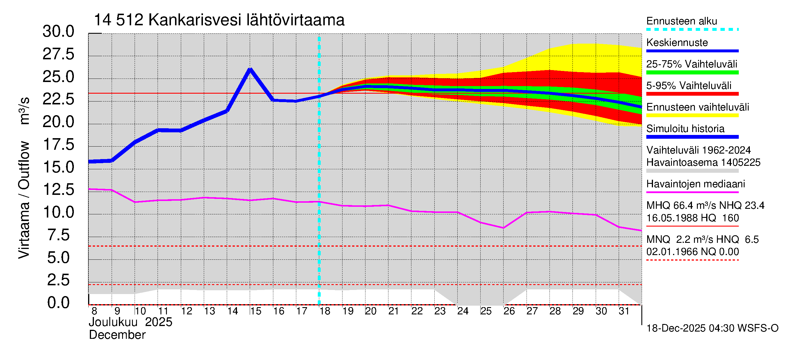 Kymijoen vesistöalue - Kankarisvesi: Lähtövirtaama / juoksutus - huippujen keski- ja ääriennusteet