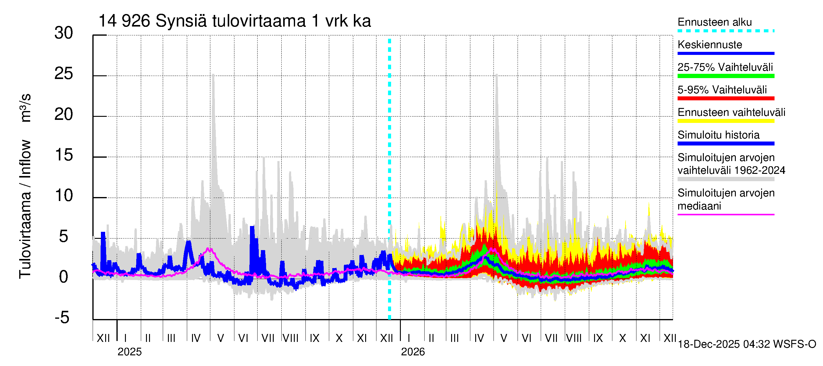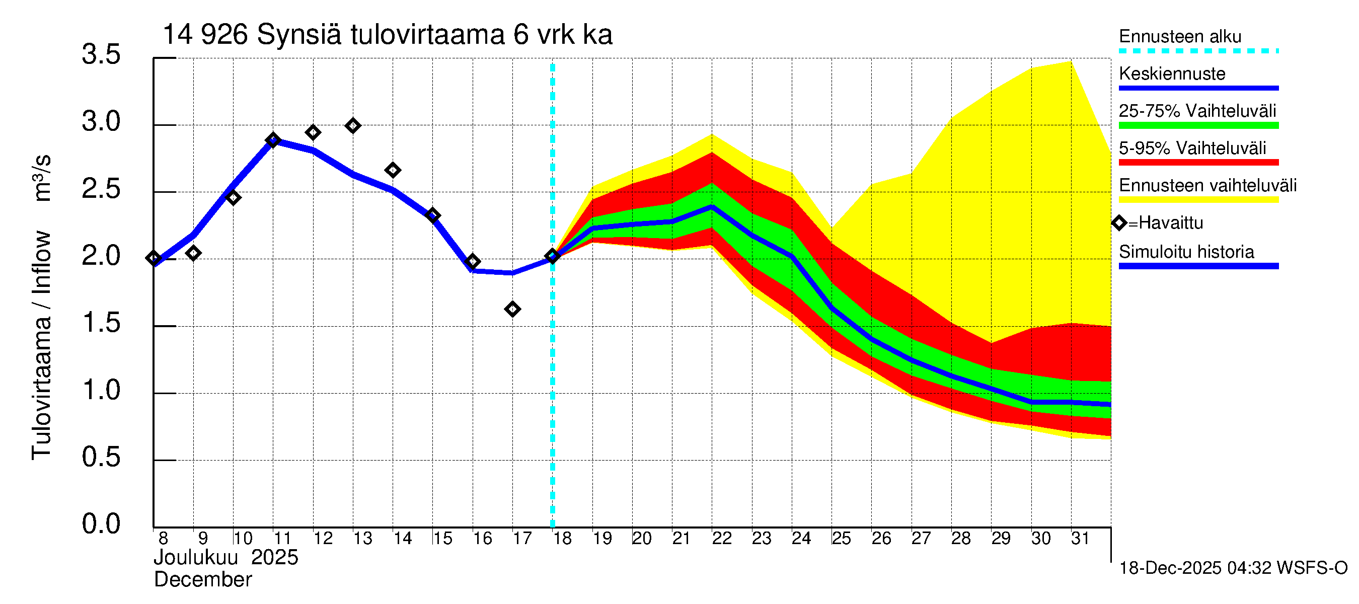 Kymijoen vesistöalue - Synsiä: Tulovirtaama (usean vuorokauden liukuva keskiarvo) - jakaumaennuste