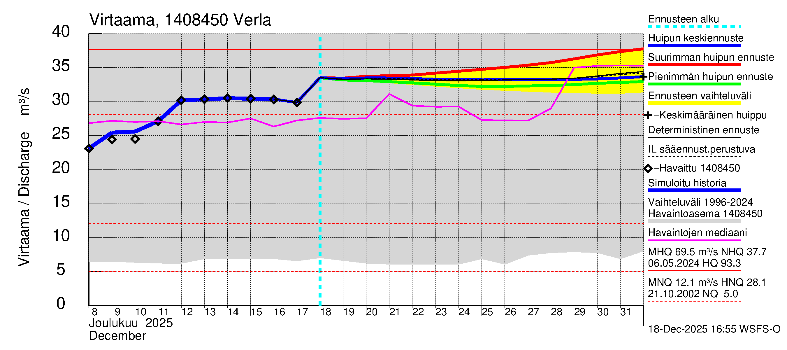 Kymijoen vesistöalue - Verla: Virtaama / juoksutus - huippujen keski- ja ääriennusteet