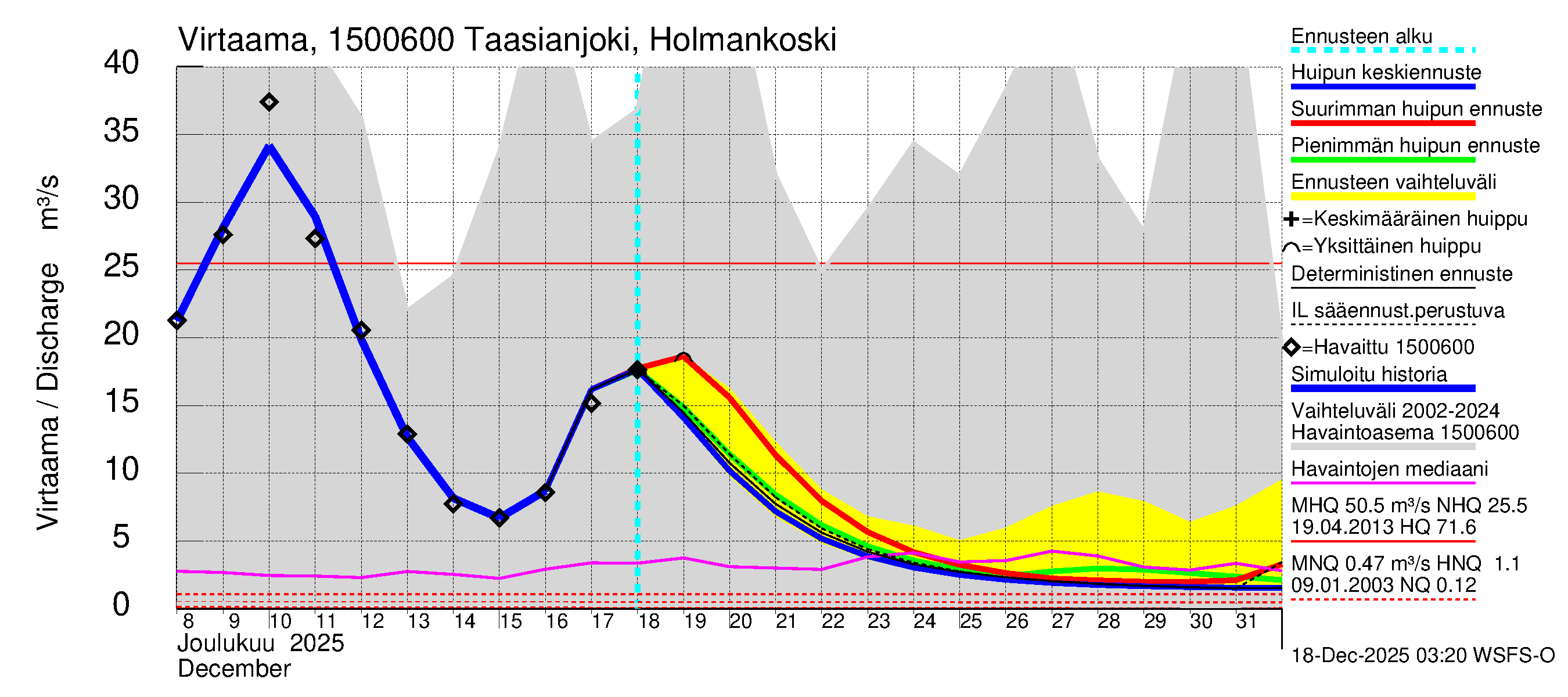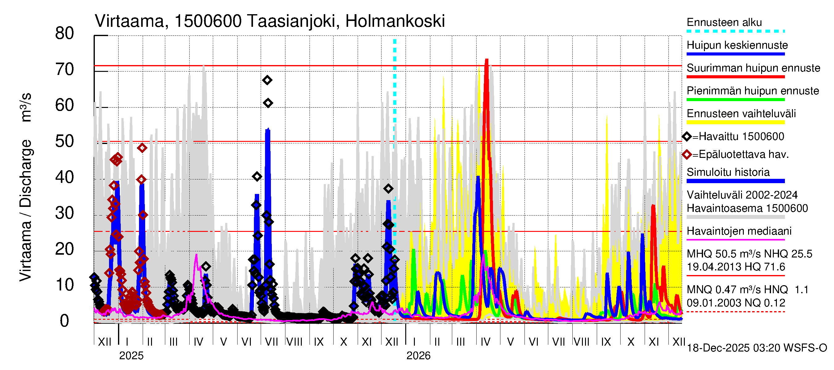 Taasianjoen vesistöalue - Holmankoski: Virtaama / juoksutus - huippujen keski- ja ääriennusteet
