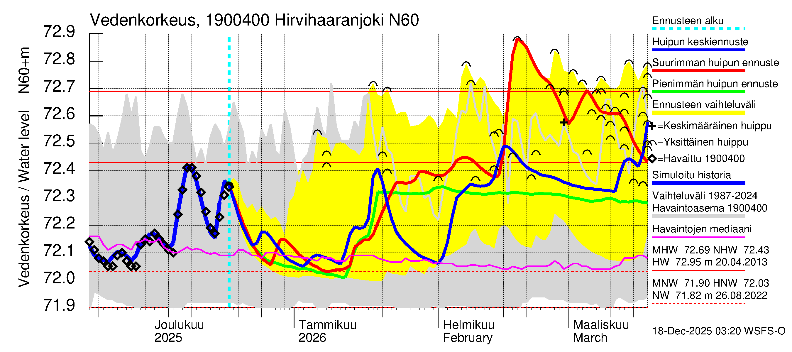 Mustijoen vesistöalue - Hirvihaaranjoki: Vedenkorkeus - huippujen keski- ja ääriennusteet