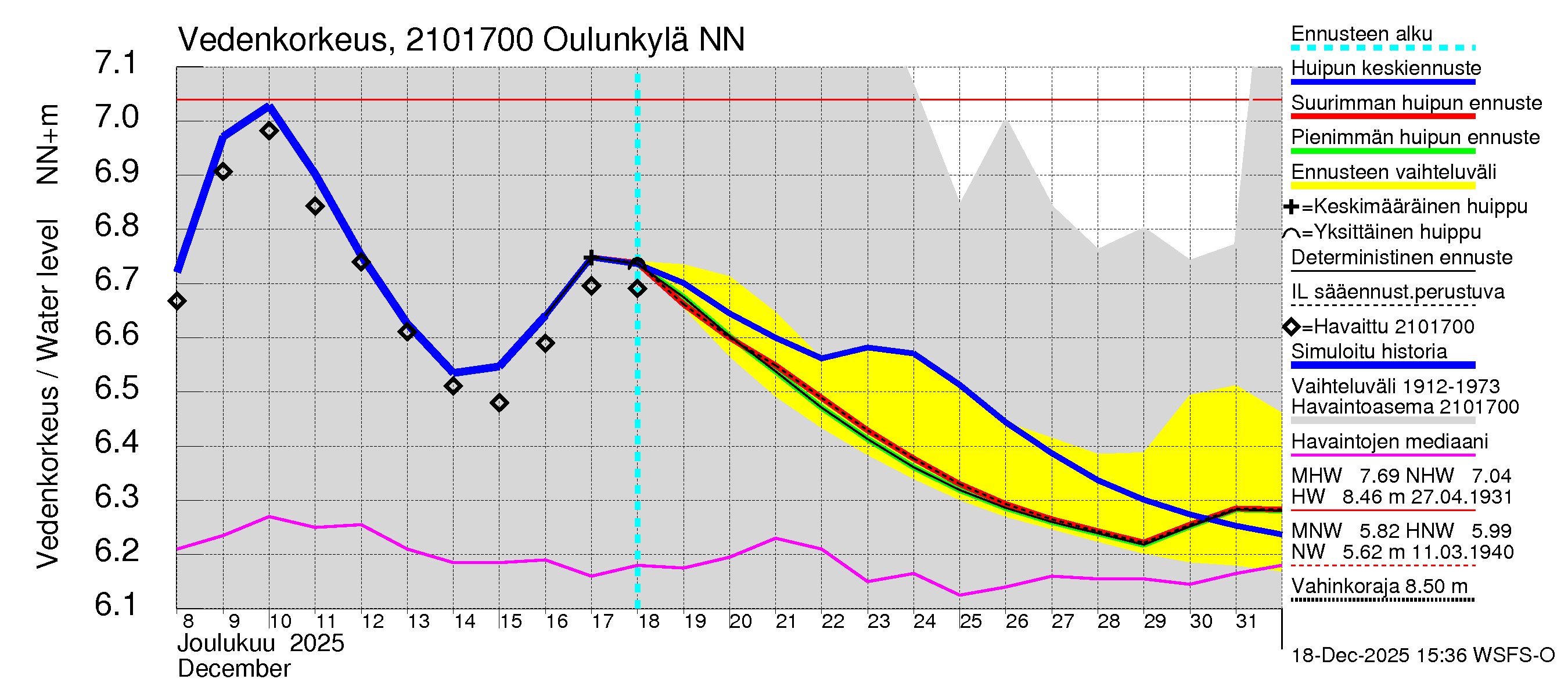 Vantaanjoen vesistöalue - Oulunkylä: Vedenkorkeus - huippujen keski- ja ääriennusteet