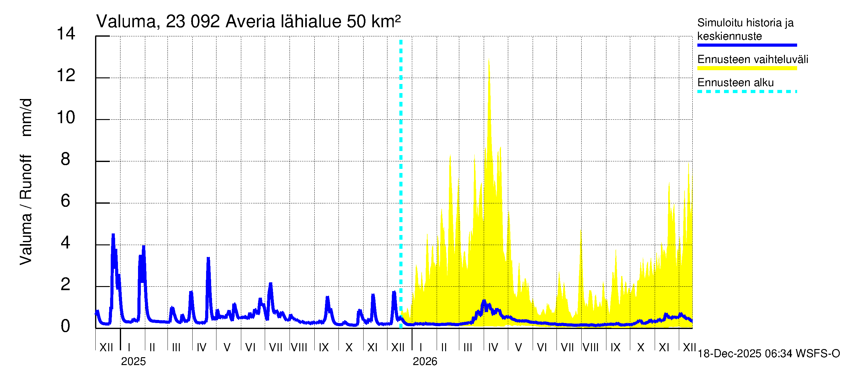 Karjaanjoen vesistöalue - Averia: Lähtövirtaama / juoksutus - huippujen keski- ja ääriennusteet