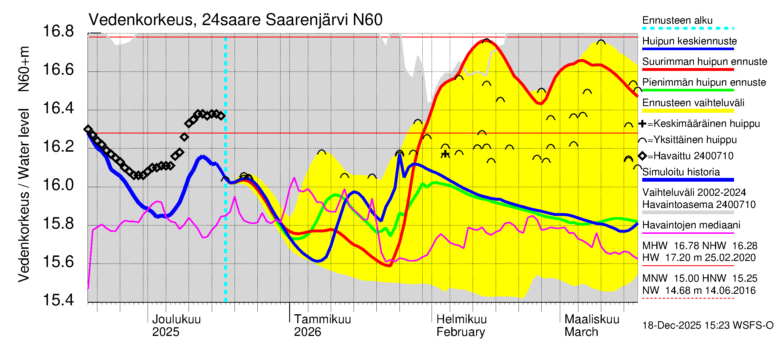 Kiskonjoen vesistöalue - Saarenjärvi: Vedenkorkeus - huippujen keski- ja ääriennusteet