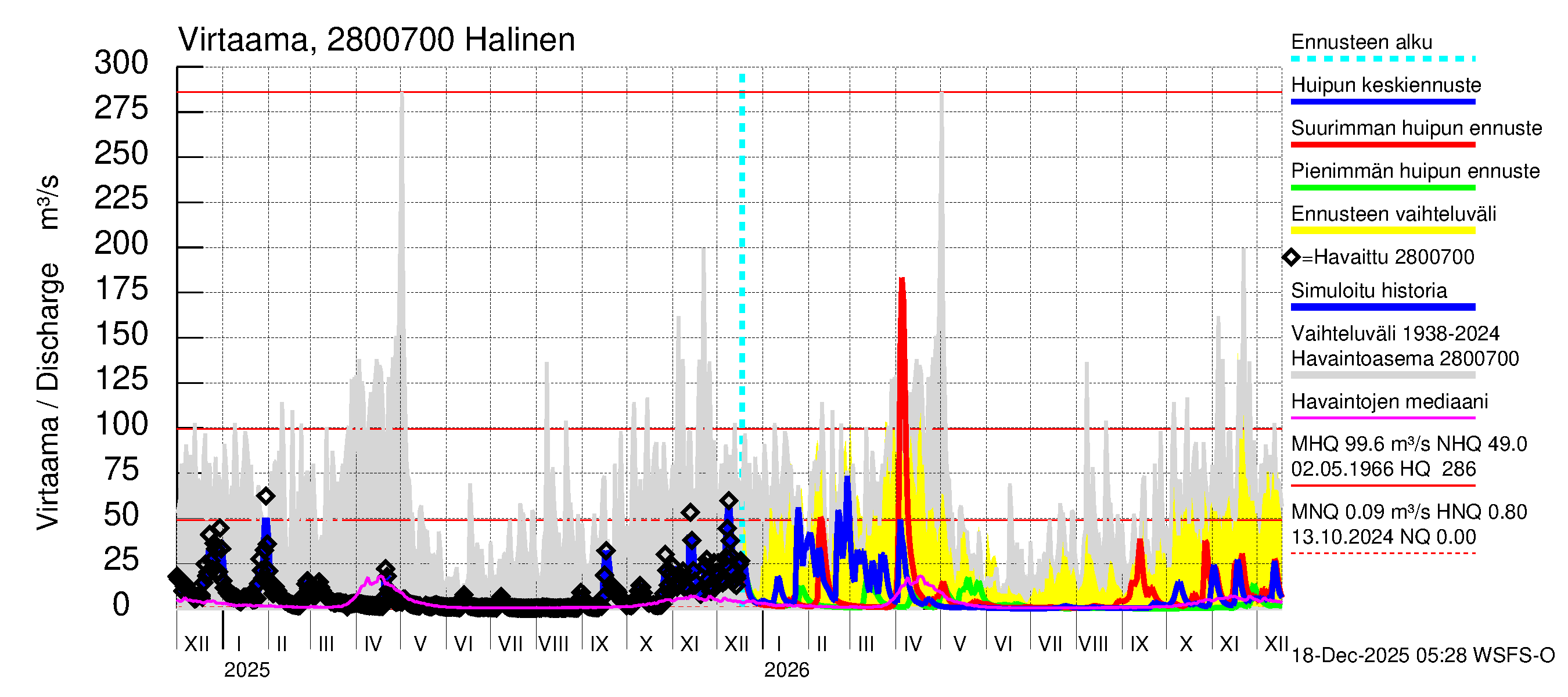 Aurajoen vesistöalue - Halinen: Virtaama / juoksutus - huippujen keski- ja ääriennusteet