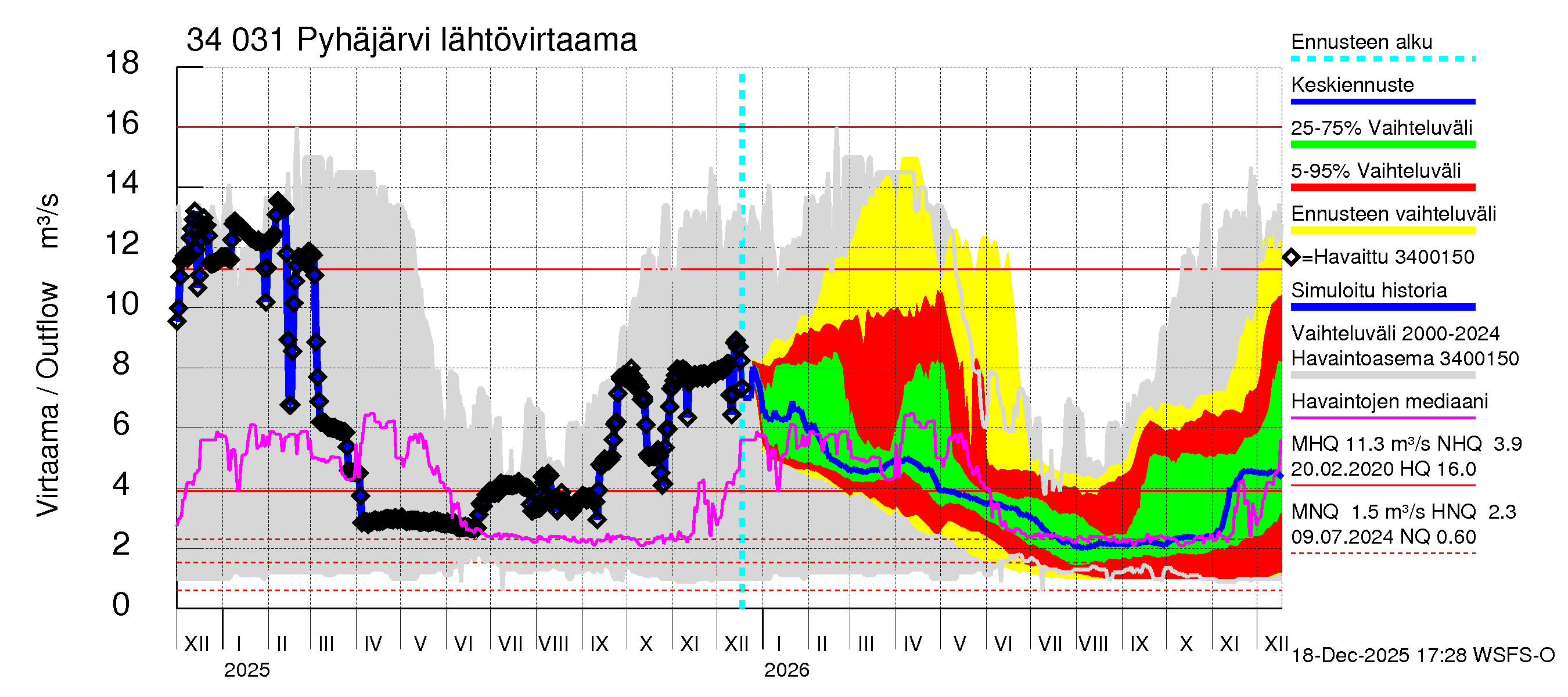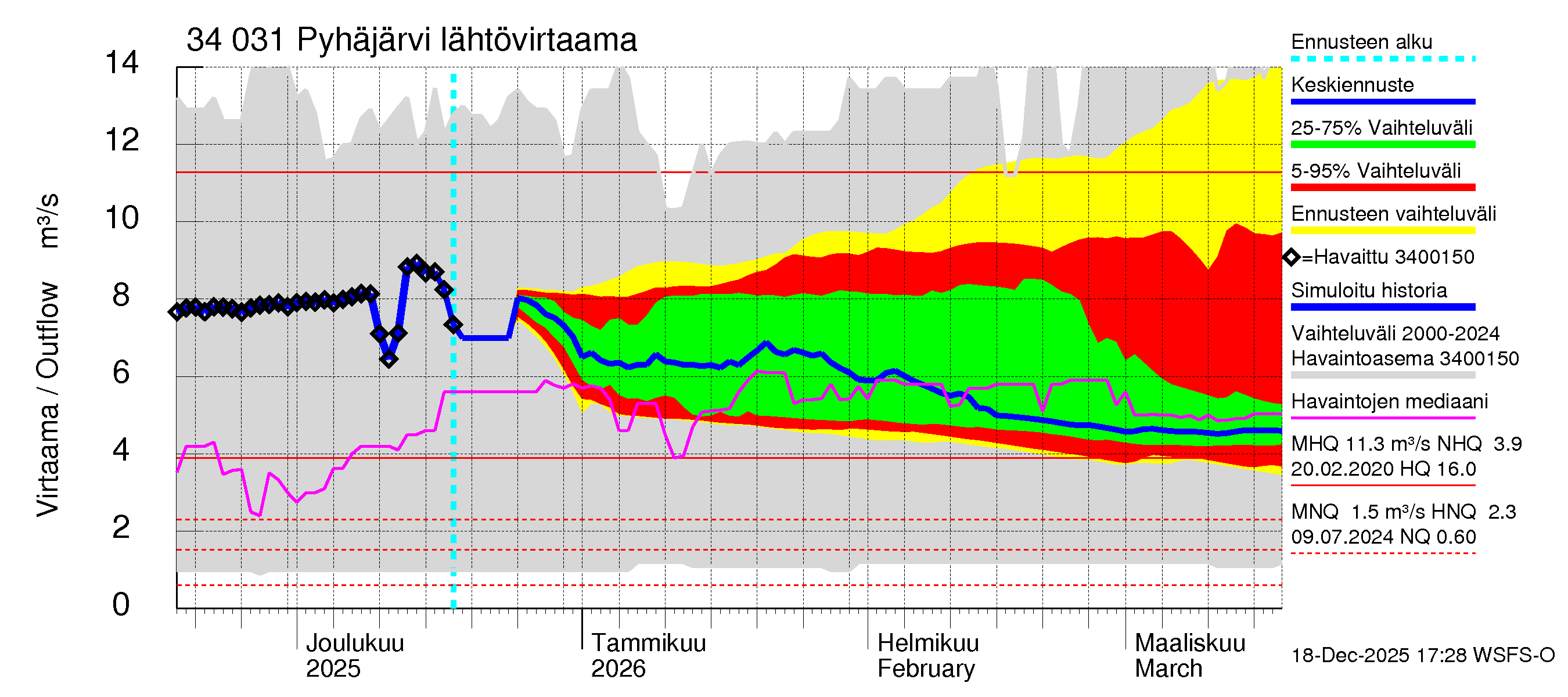 Eurajoen vesistöalue - Pyhäjärvi: Lähtövirtaama / juoksutus - huippujen keski- ja ääriennusteet