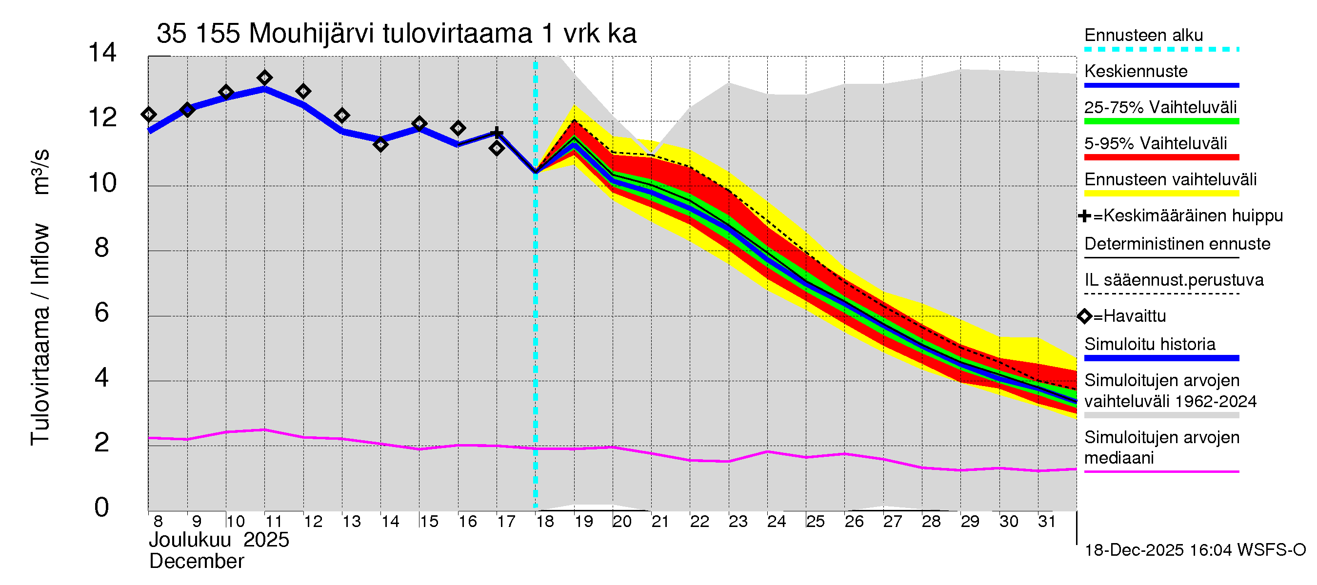 Kokemäenjoen vesistöalue - Mouhijärvi: Lähtövirtaama / juoksutus - huippujen keski- ja ääriennusteet