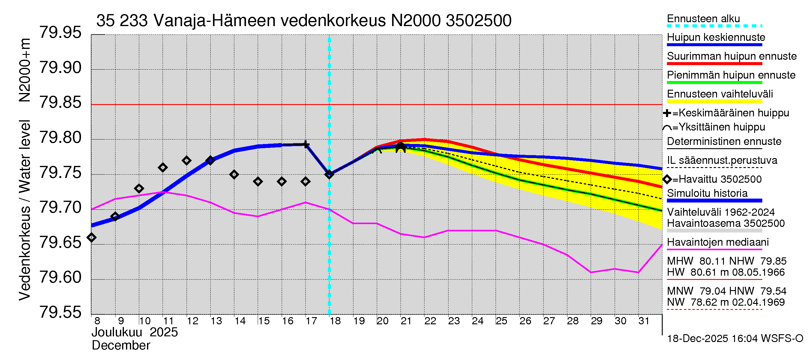 Kokemäenjoen vesistöalue - Vanaja / Hämeenlinna: Vedenkorkeus - huippujen keski- ja ääriennusteet