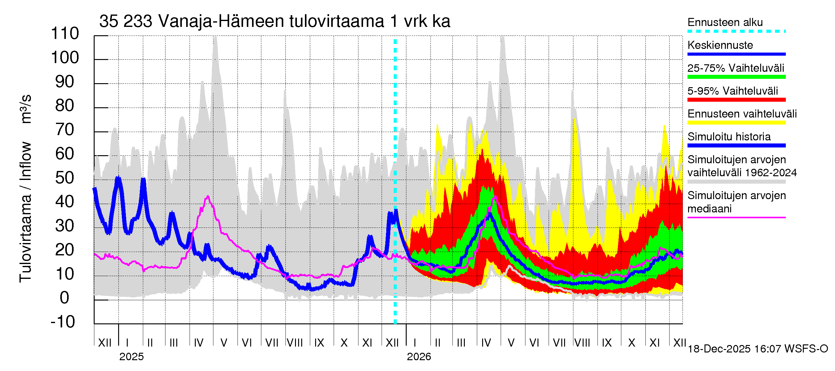 Kokemäenjoen vesistöalue - Vanaja / Hämeenlinna: Tulovirtaama (usean vuorokauden liukuva keskiarvo) - jakaumaennuste