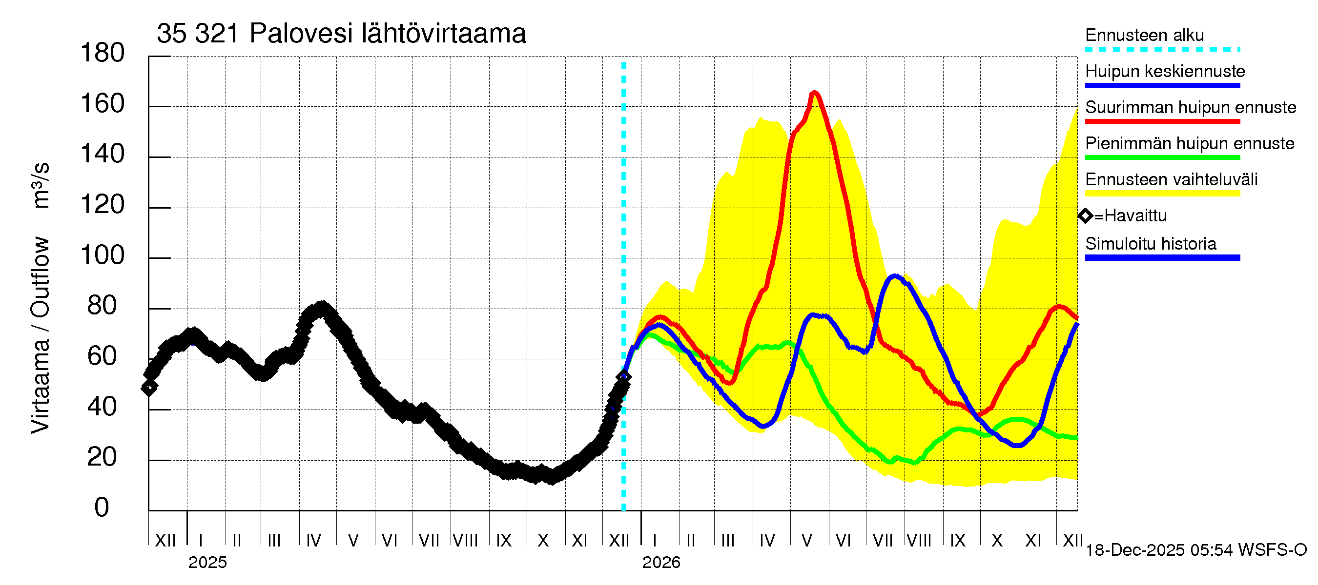 Kokemäenjoen vesistöalue - Ruovesi-Palovesi: Lähtövirtaama / juoksutus - huippujen keski- ja ääriennusteet