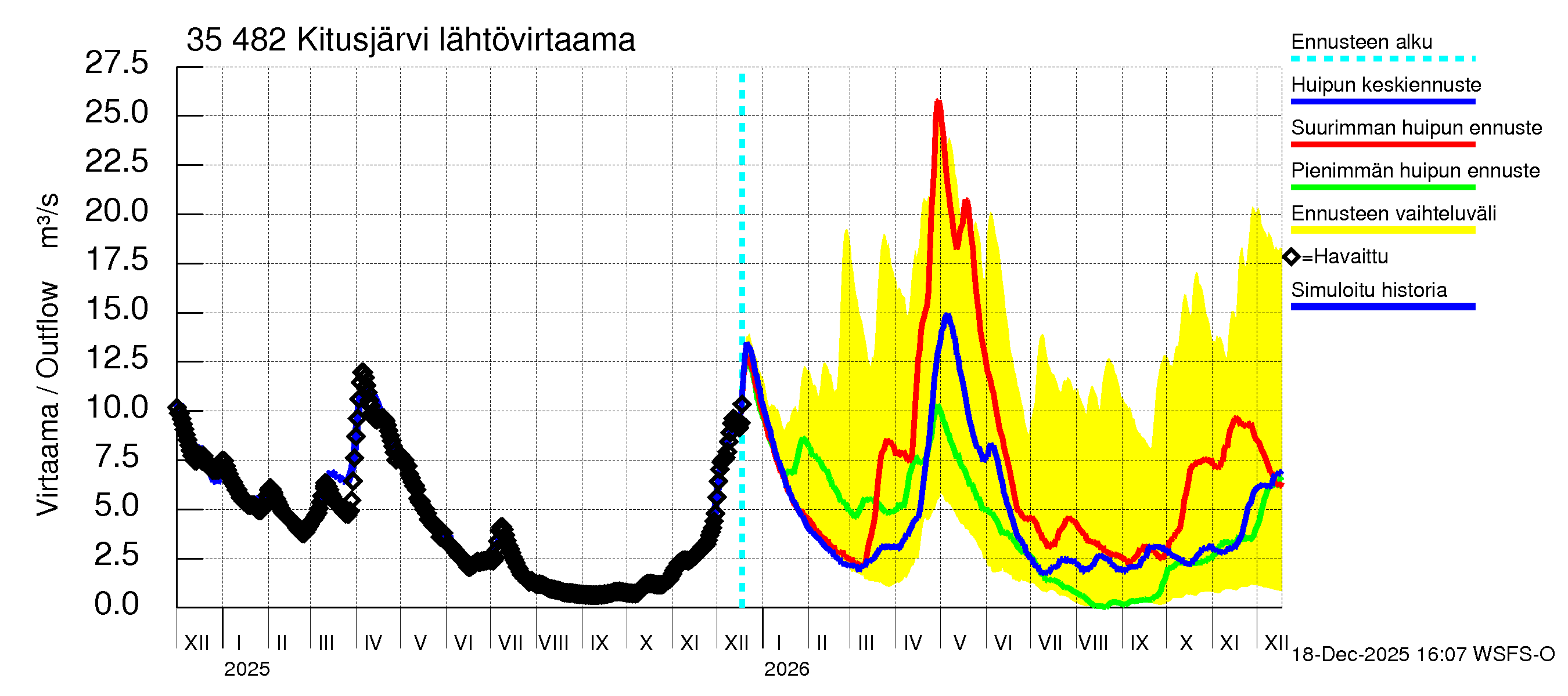 Kokemäenjoen vesistöalue - Kitusjärvi: Lähtövirtaama / juoksutus - huippujen keski- ja ääriennusteet