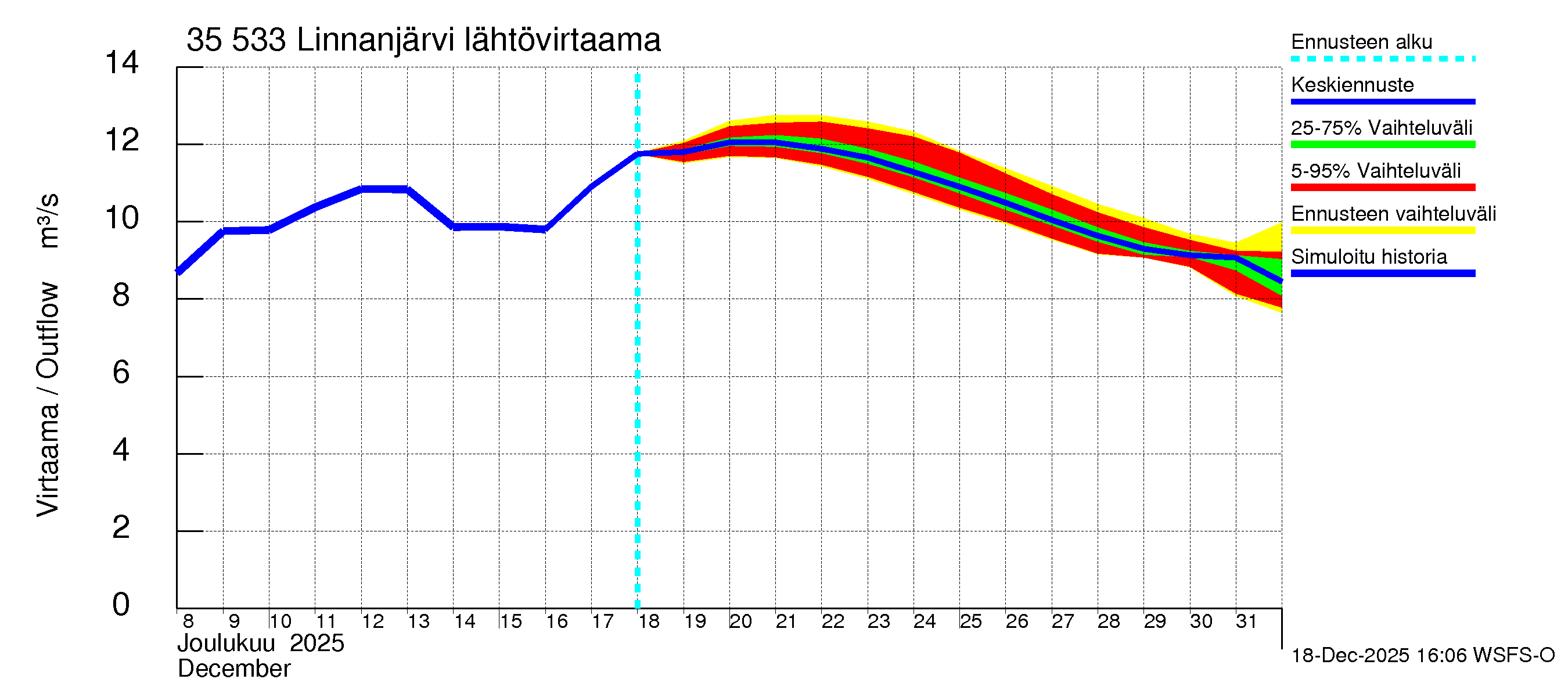 Kokemäenjoen vesistöalue - Linnanjärvi: Lähtövirtaama / juoksutus - huippujen keski- ja ääriennusteet