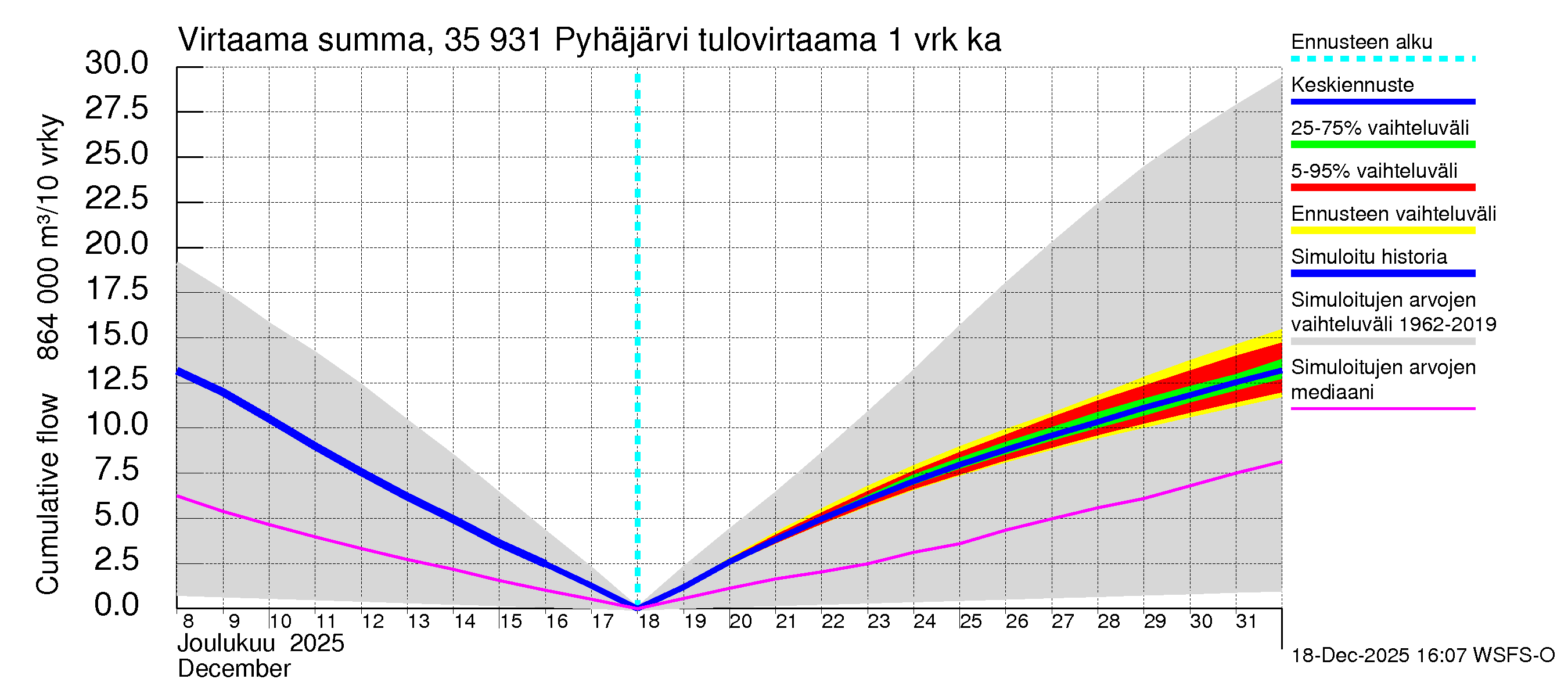 Kokemäenjoen vesistöalue - Pyhäjärvi: Tulovirtaama (usean vuorokauden liukuva keskiarvo) - jakaumaennuste