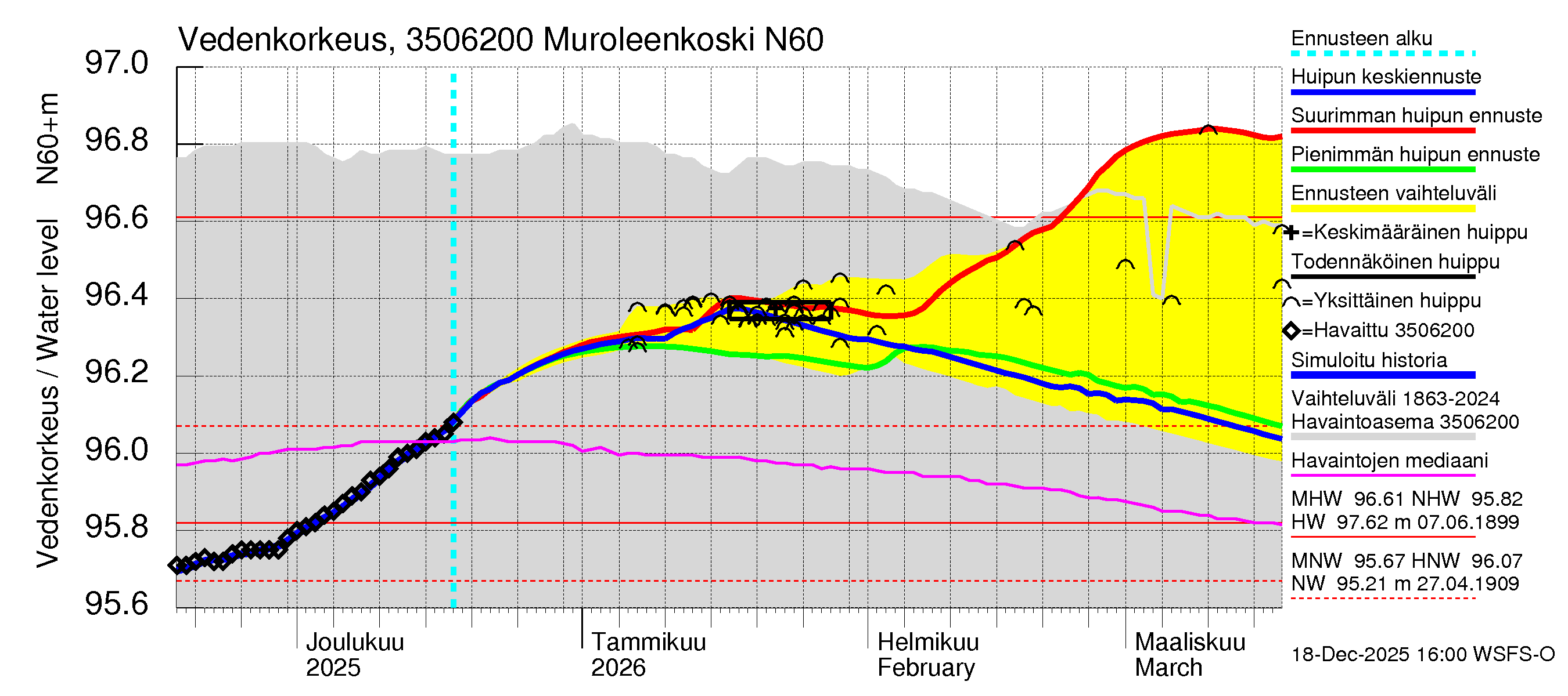 Kokemäenjoen vesistöalue - Muroleenkoski: Vedenkorkeus - huippujen keski- ja ääriennusteet
