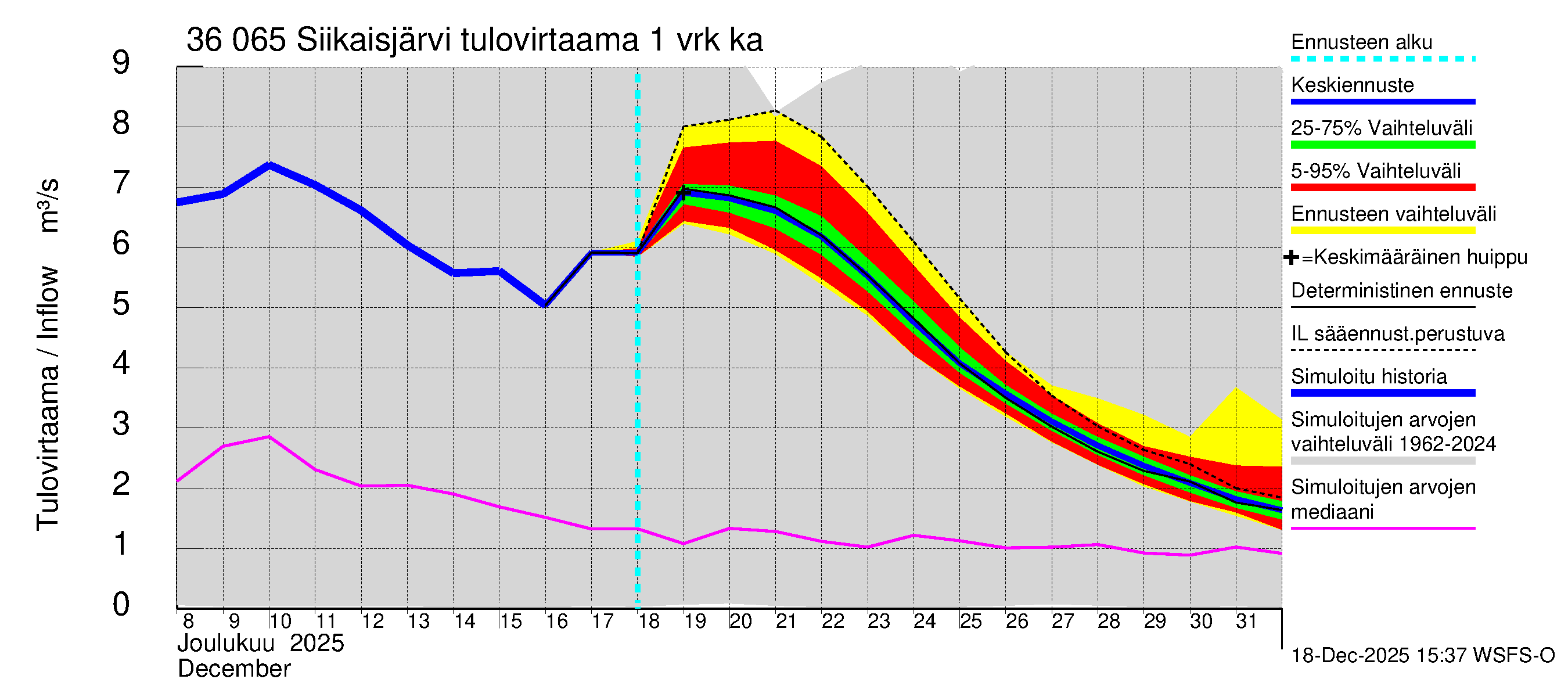 Karvianjoen vesistöalue - Siikaisjärvi: Tulovirtaama (usean vuorokauden liukuva keskiarvo) - jakaumaennuste