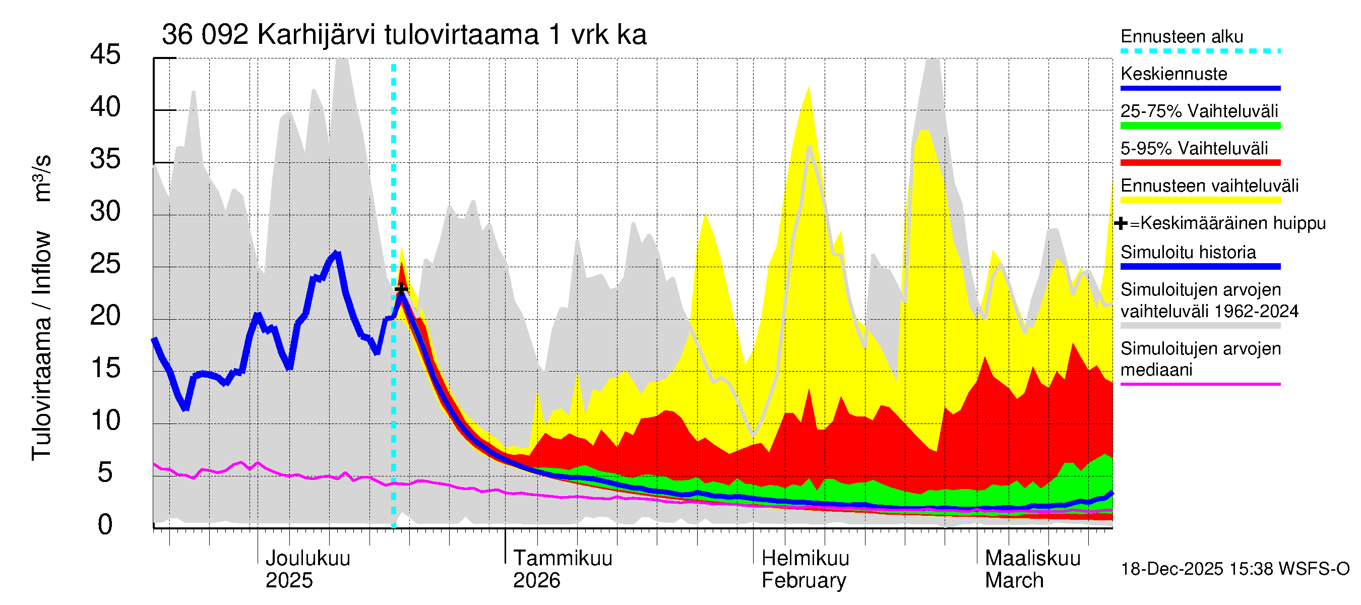 Karvianjoen vesistöalue - Karhijärvi: Tulovirtaama (usean vuorokauden liukuva keskiarvo) - jakaumaennuste
