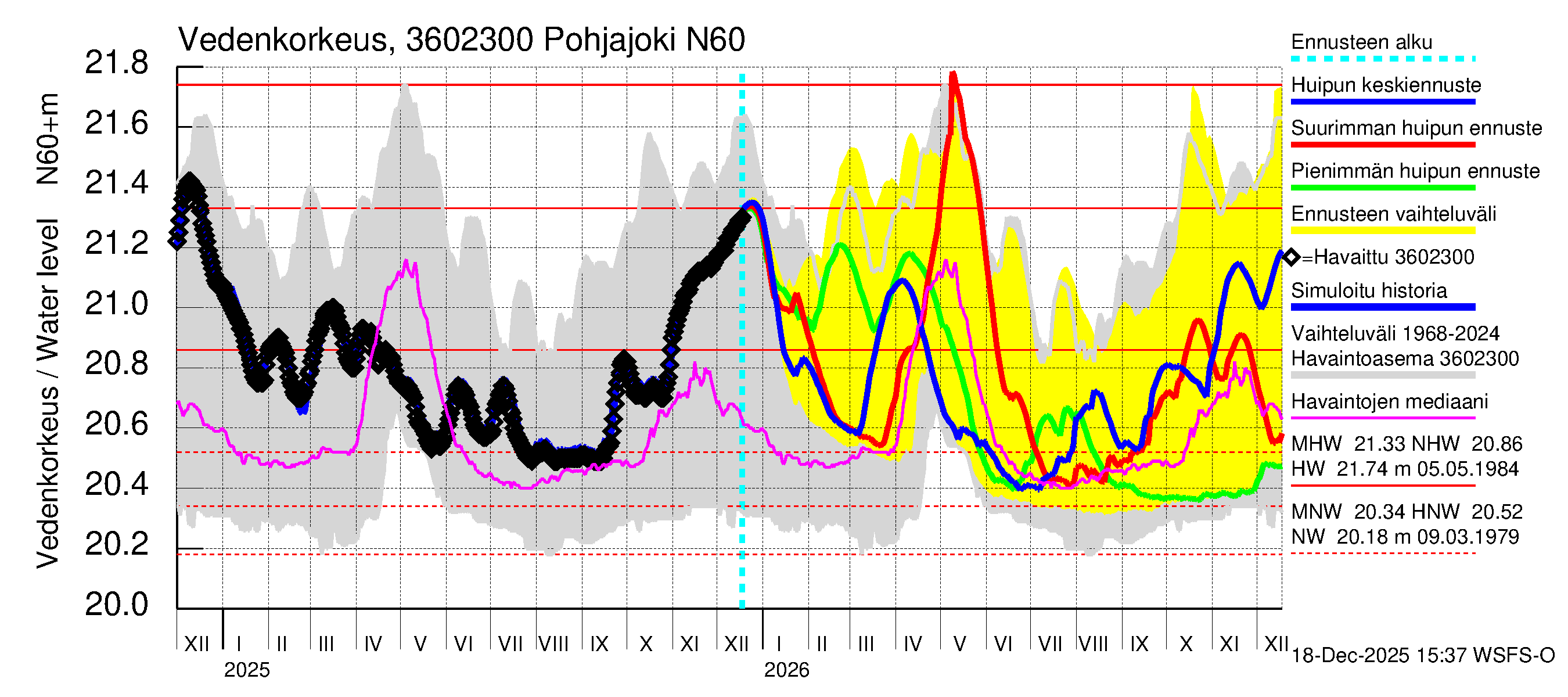 Karvianjoen vesistöalue - Pohjajoki: Vedenkorkeus - huippujen keski- ja ääriennusteet