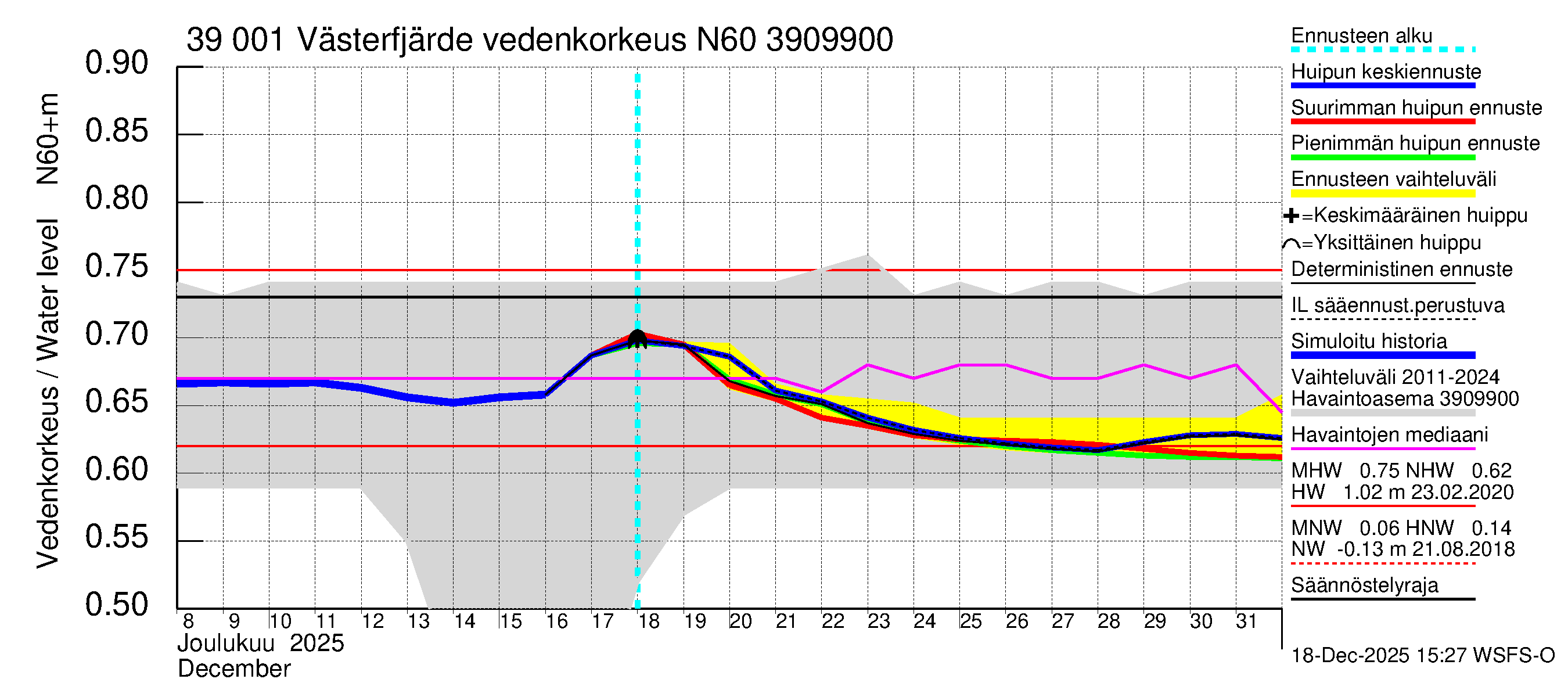 Närpiönjoen vesistöalue - Västerfjärden: Vedenkorkeus - huippujen keski- ja ääriennusteet