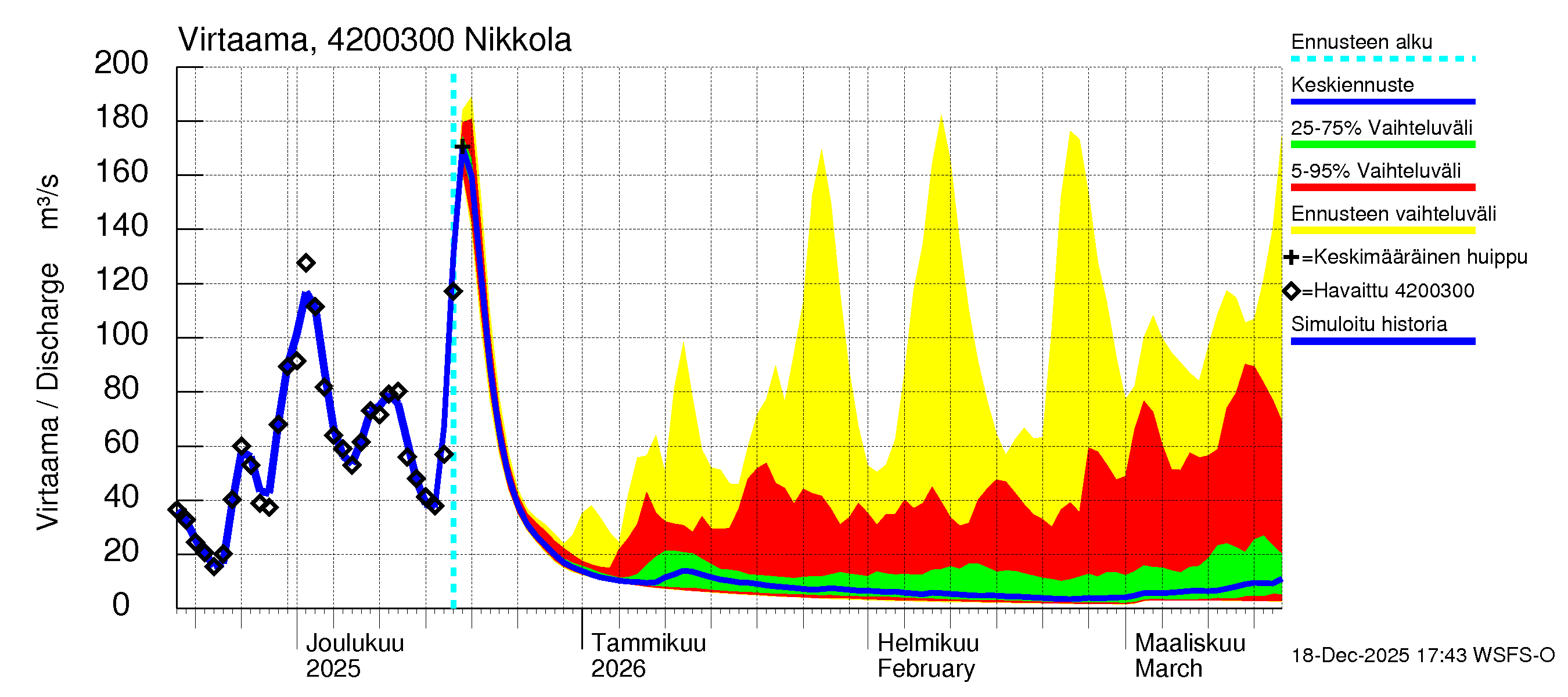 Kyrönjoen vesistöalue - Nikkola: Virtaama / juoksutus - huippujen keski- ja ääriennusteet