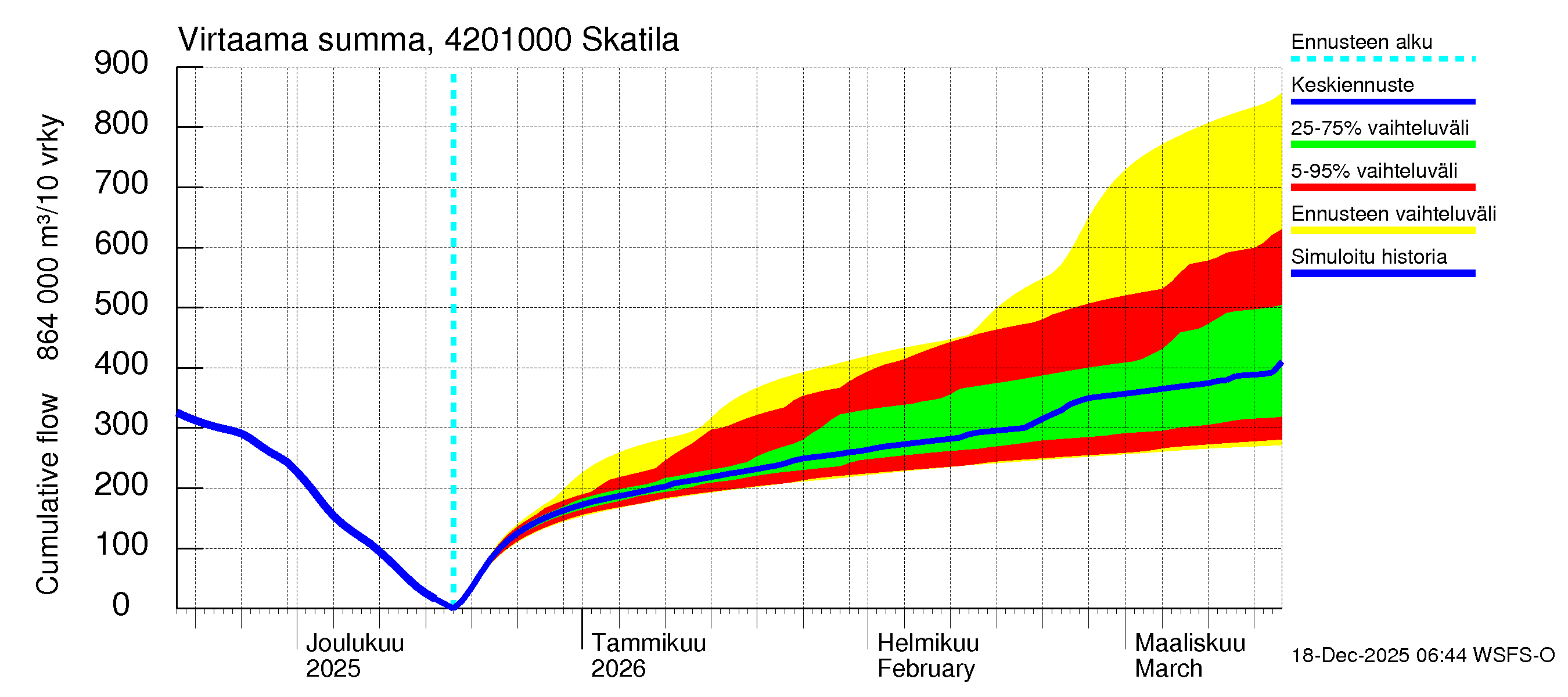 Kyrönjoen vesistöalue - Skatila: Virtaama / juoksutus - huippujen keski- ja ääriennusteet