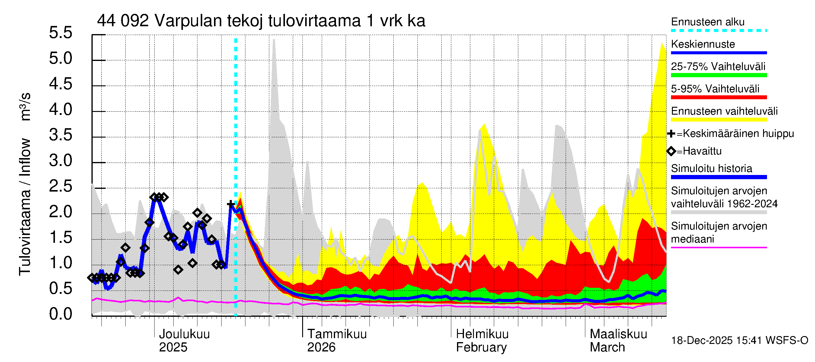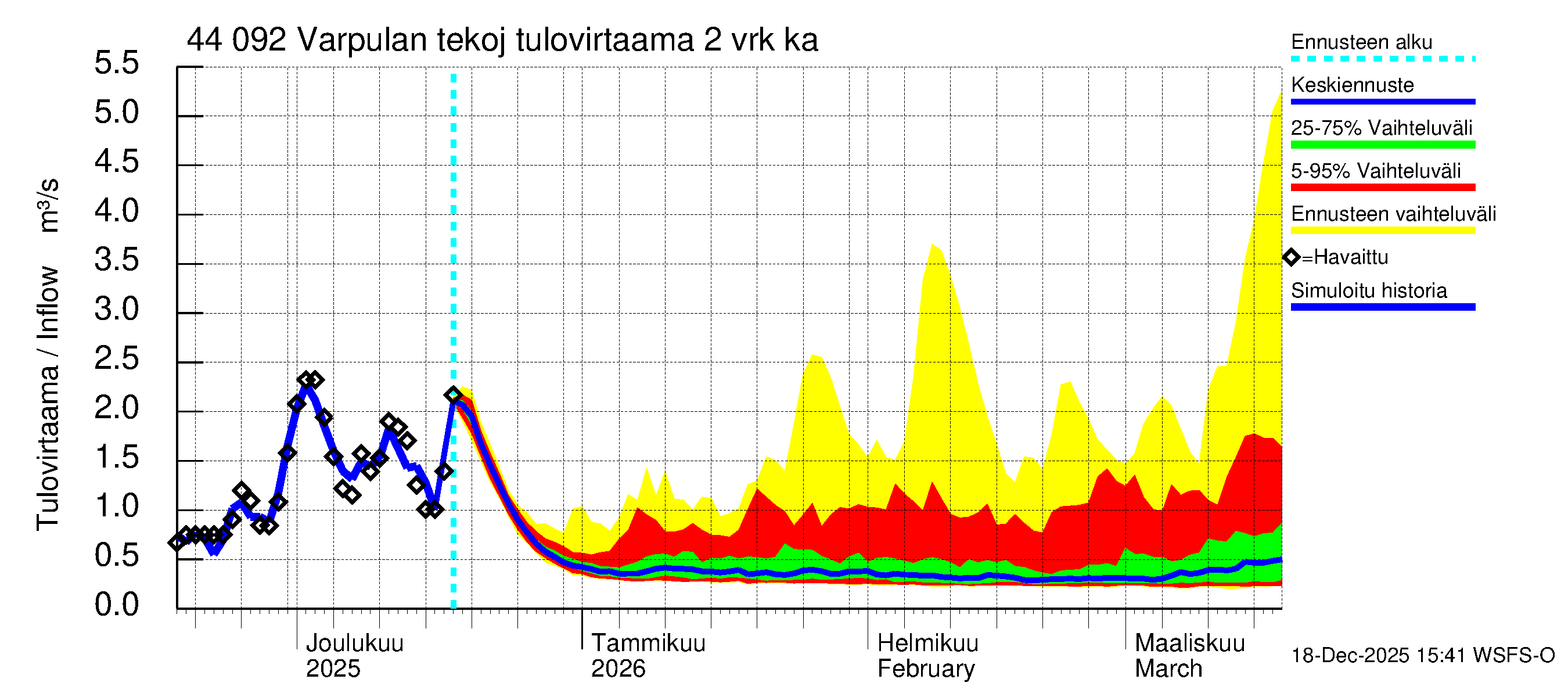 Lapuanjoen vesistöalue - Varpulan tekojärvi: Tulovirtaama (usean vuorokauden liukuva keskiarvo) - jakaumaennuste