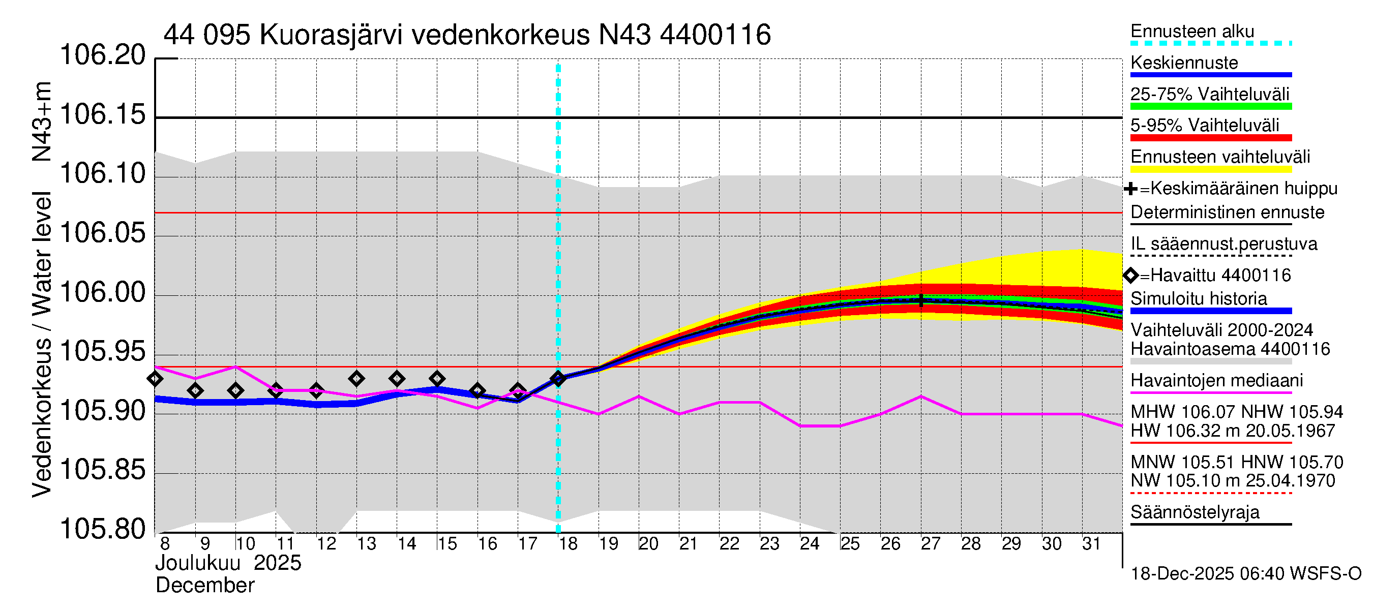 Lapuanjoen vesistöalue - Kuorasjärvi: Vedenkorkeus - huippujen keski- ja ääriennusteet