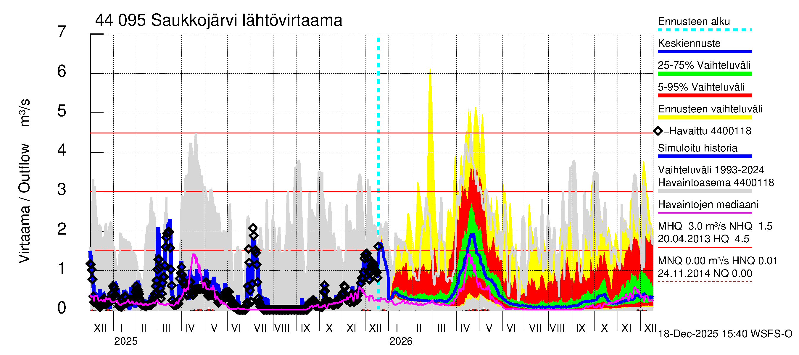 Lapuanjoen vesistöalue - Saukkojärvi: Lähtövirtaama / juoksutus - huippujen keski- ja ääriennusteet