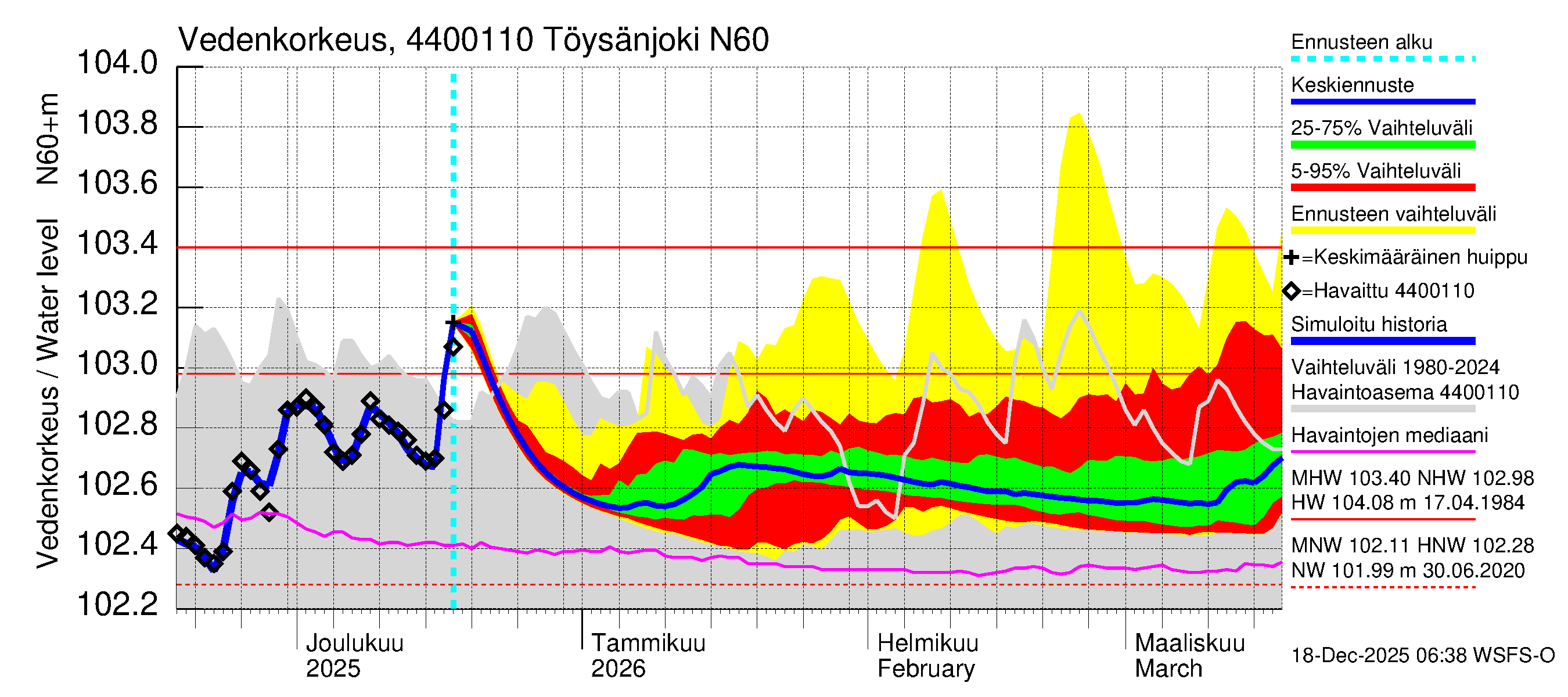 Lapuanjoen vesistöalue - Töysänjoki: Vedenkorkeus - huippujen keski- ja ääriennusteet