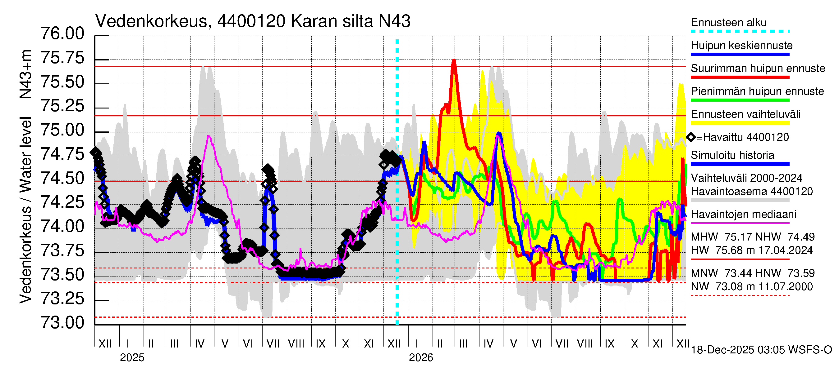 Lapuanjoen vesistöalue - Karan silta: Vedenkorkeus - huippujen keski- ja ääriennusteet