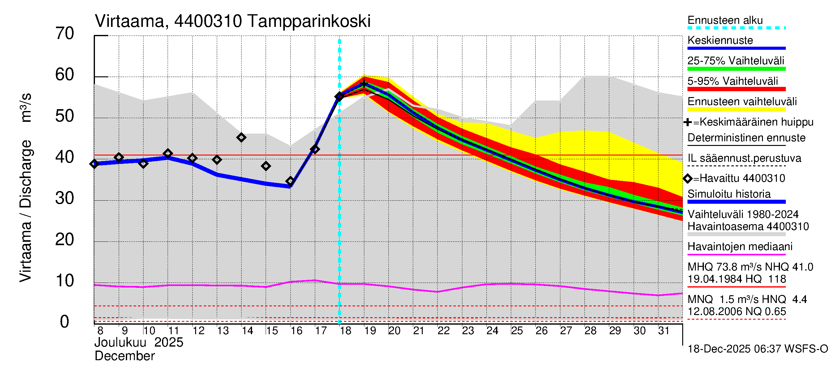 Lapuanjoen vesistöalue - Tampparinkoski: Virtaama / juoksutus - huippujen keski- ja ääriennusteet