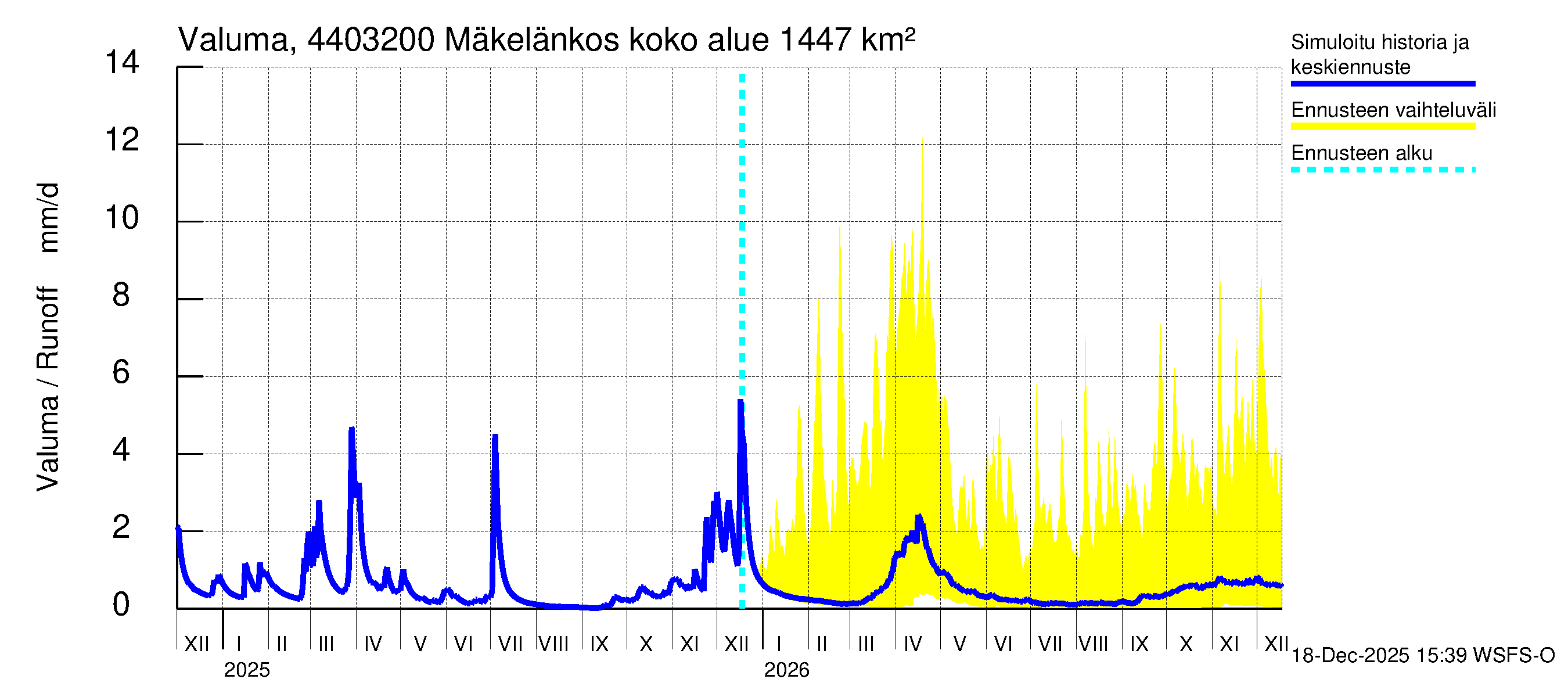 Lapuanjoen vesistöalue - Mäkelänkoski: Virtaama / juoksutus - huippujen keski- ja ääriennusteet
