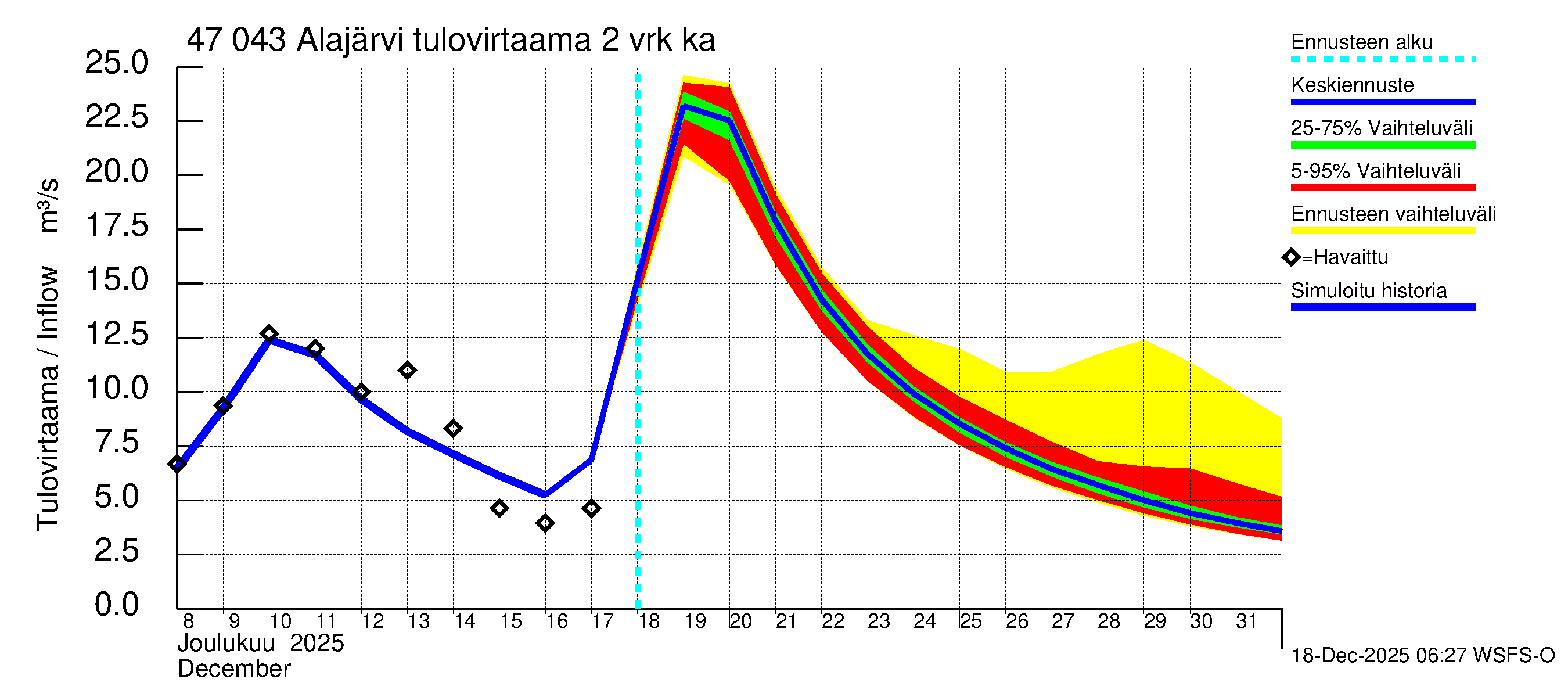 Ähtävänjoen vesistöalue - Alajärvi: Tulovirtaama (usean vuorokauden liukuva keskiarvo) - jakaumaennuste