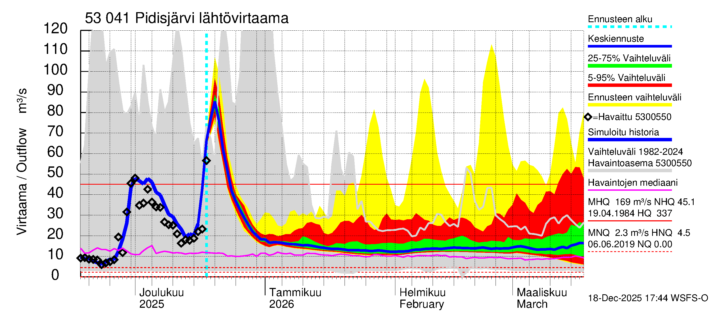 Kalajoen vesistöalue - Pidisjärvi: Lähtövirtaama / juoksutus - huippujen keski- ja ääriennusteet