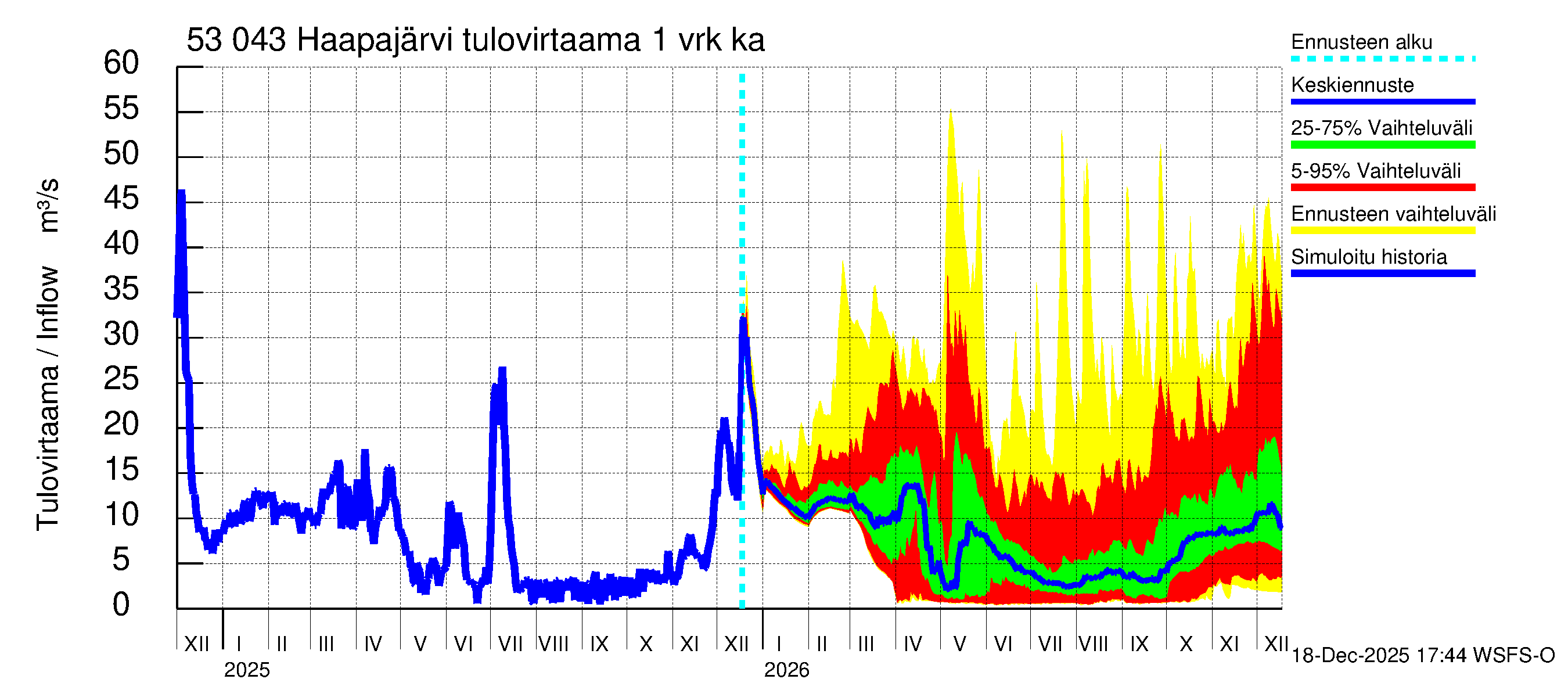 Kalajoen vesistöalue - Haapajärvi: Tulovirtaama (usean vuorokauden liukuva keskiarvo) - jakaumaennuste