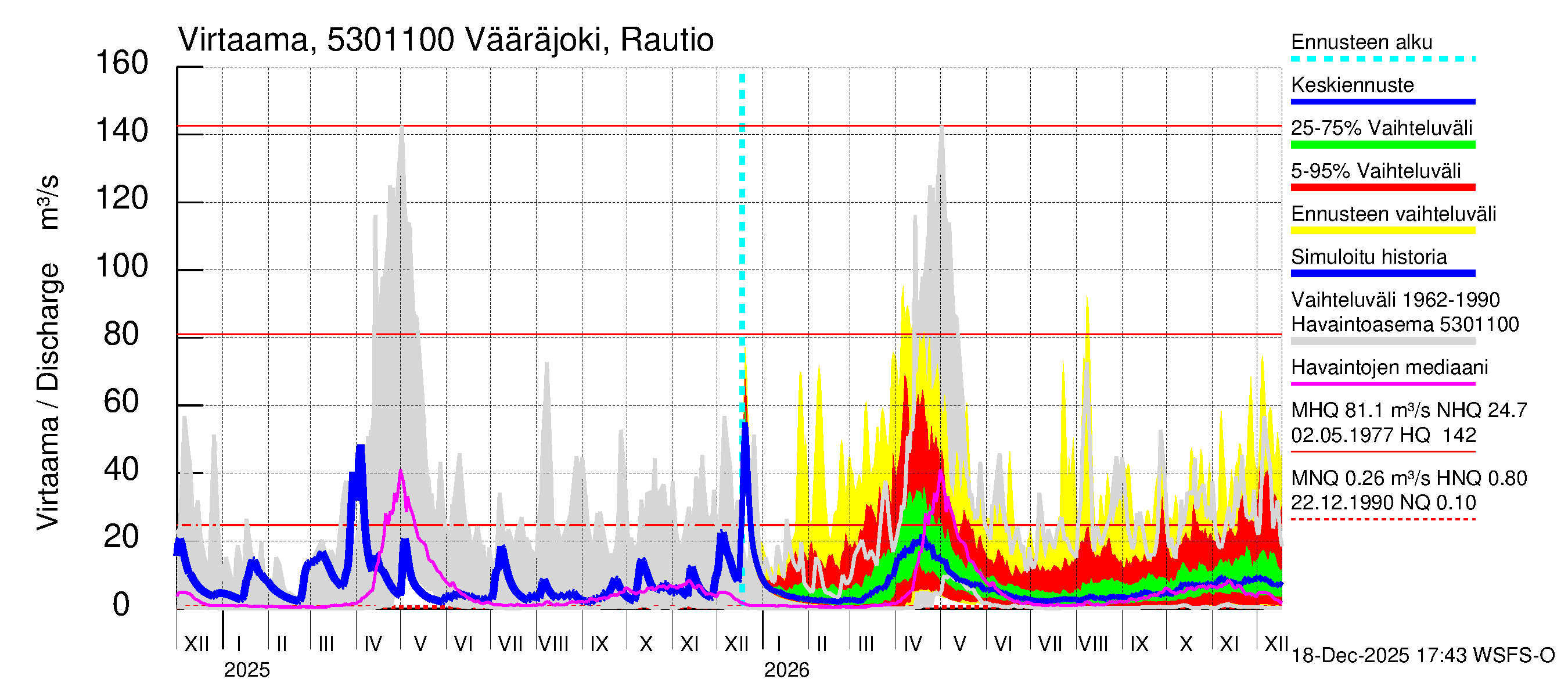 Kalajoen vesistöalue - Vääräjoki Rautio: Virtaama / juoksutus - huippujen keski- ja ääriennusteet