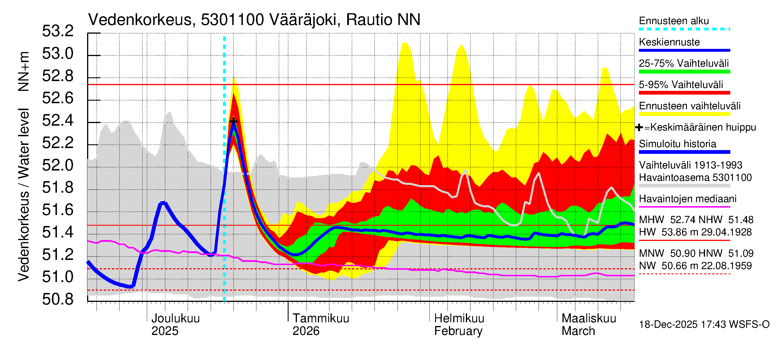 Kalajoen vesistöalue - Vääräjoki Rautio: Vedenkorkeus - huippujen keski- ja ääriennusteet
