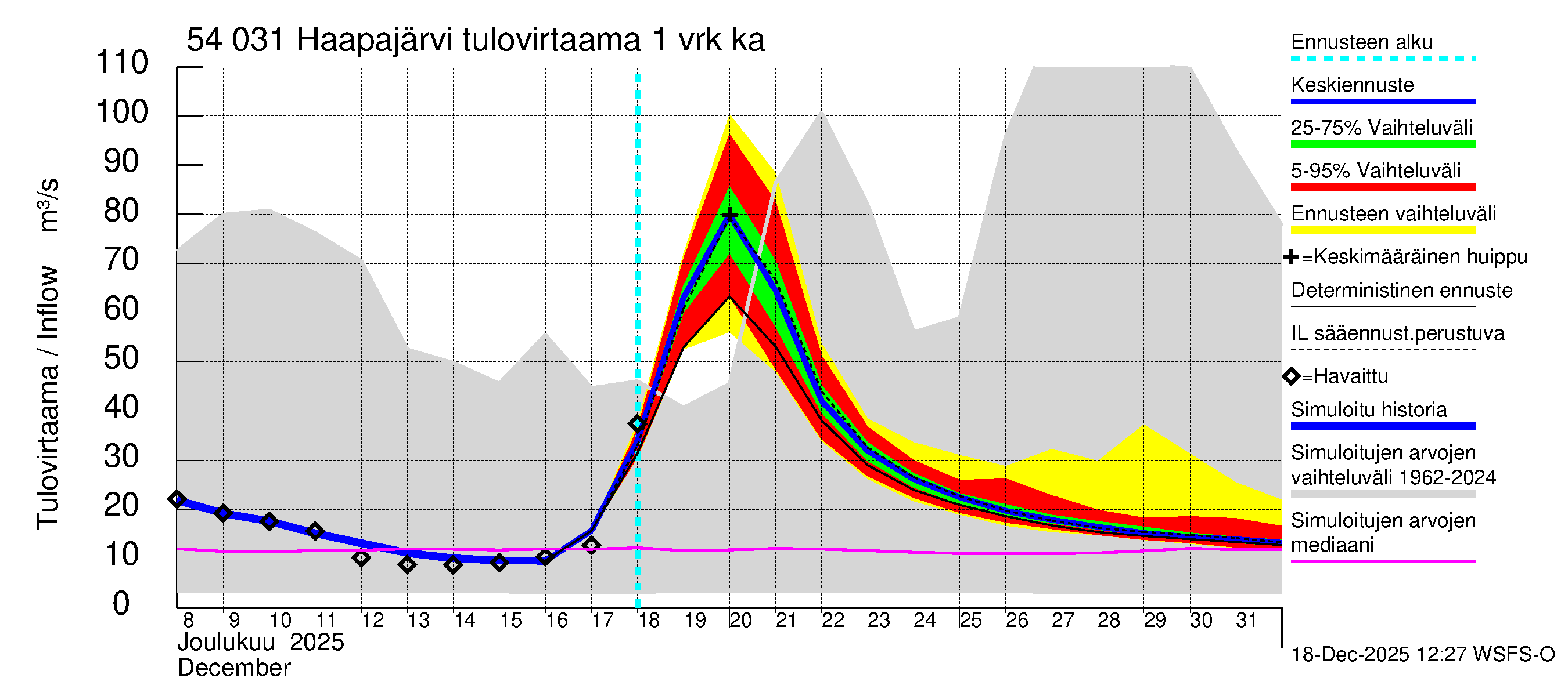 Pyhäjoen vesistöalue - Haapajärvi: Tulovirtaama (usean vuorokauden liukuva keskiarvo) - jakaumaennuste