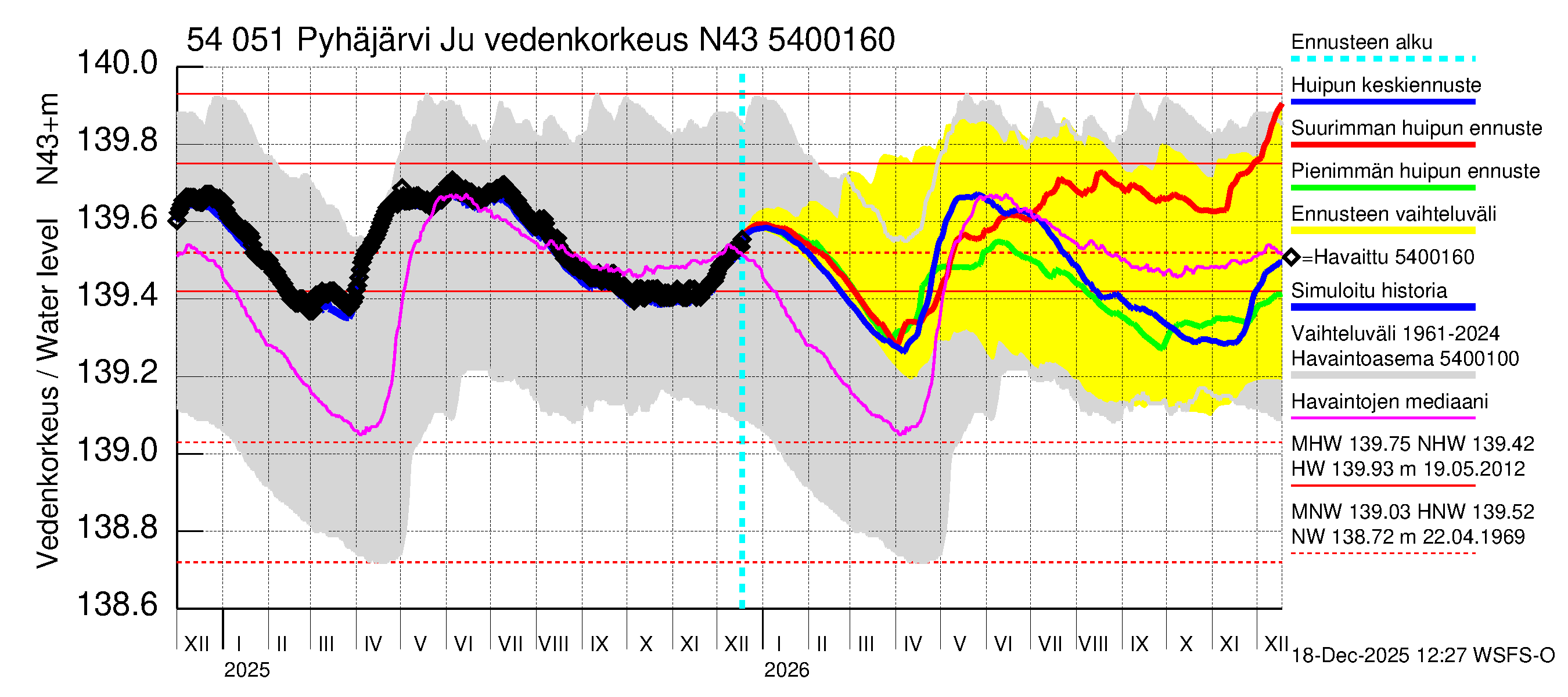 Pyhäjoen vesistöalue - Pyhäjärvi Junttiselkä: Vedenkorkeus - huippujen keski- ja ääriennusteet