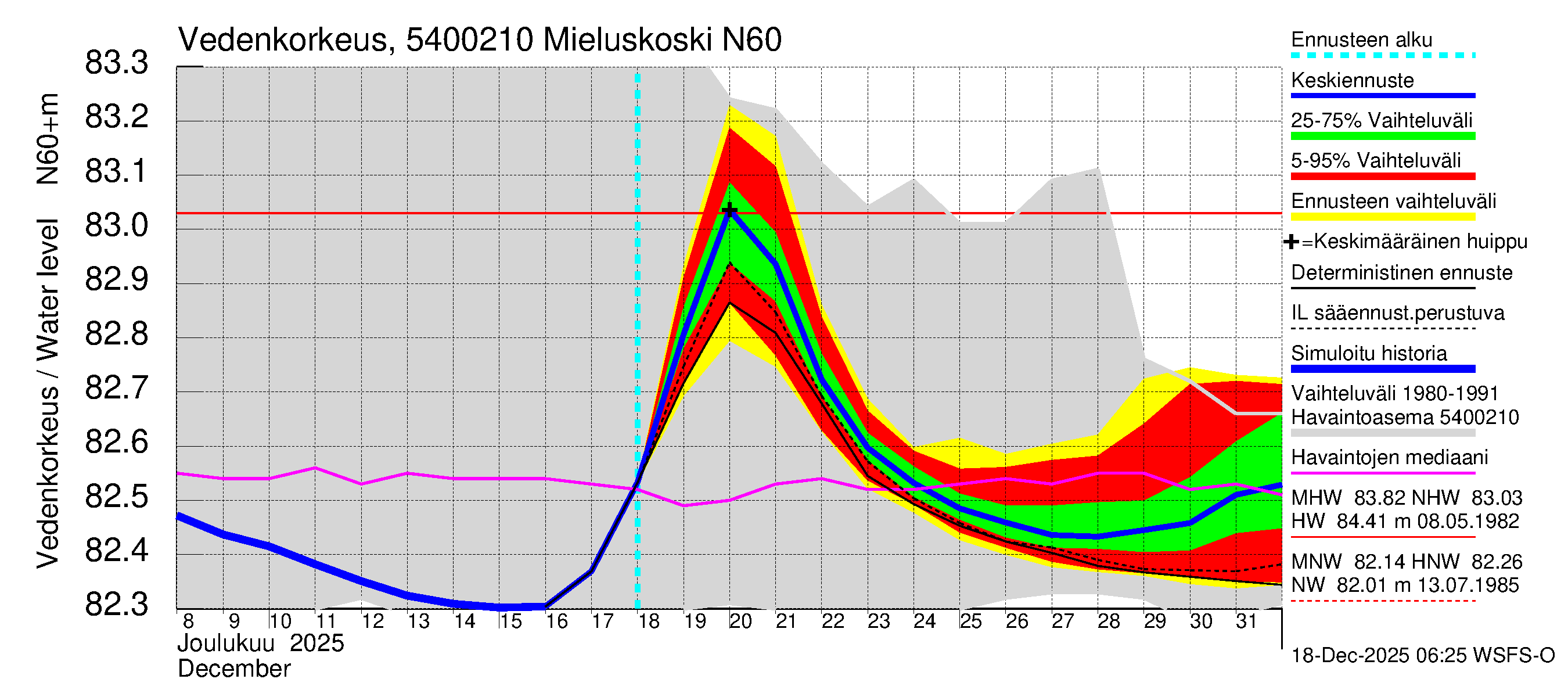 Pyhäjoen vesistöalue - Mieluskoski: Vedenkorkeus - huippujen keski- ja ääriennusteet