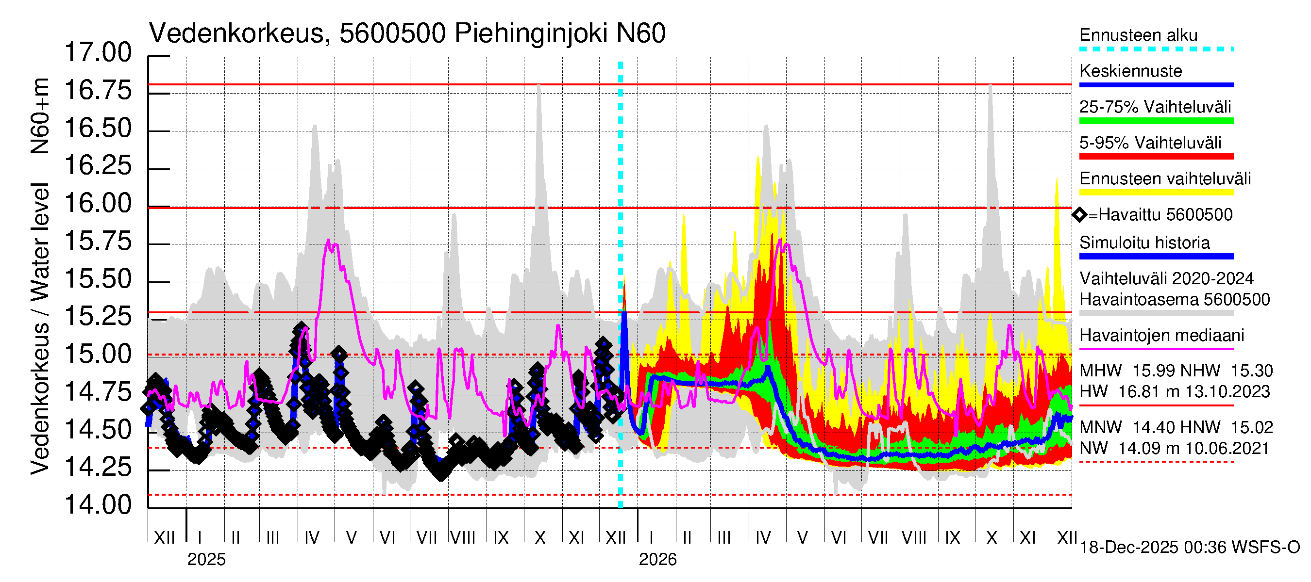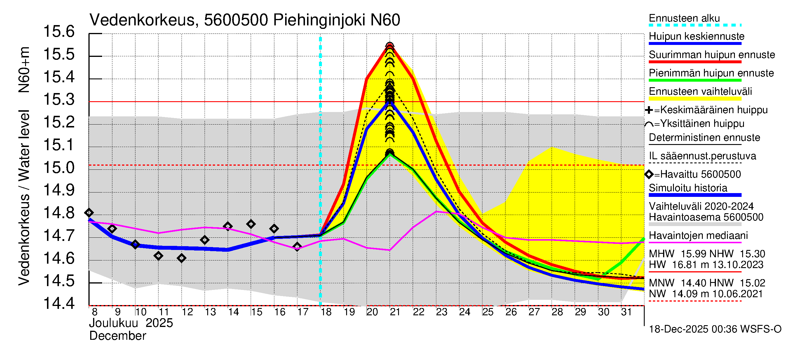 Piehinginjoen vesistöalue - Piehinginjoki: Vedenkorkeus - huippujen keski- ja ääriennusteet