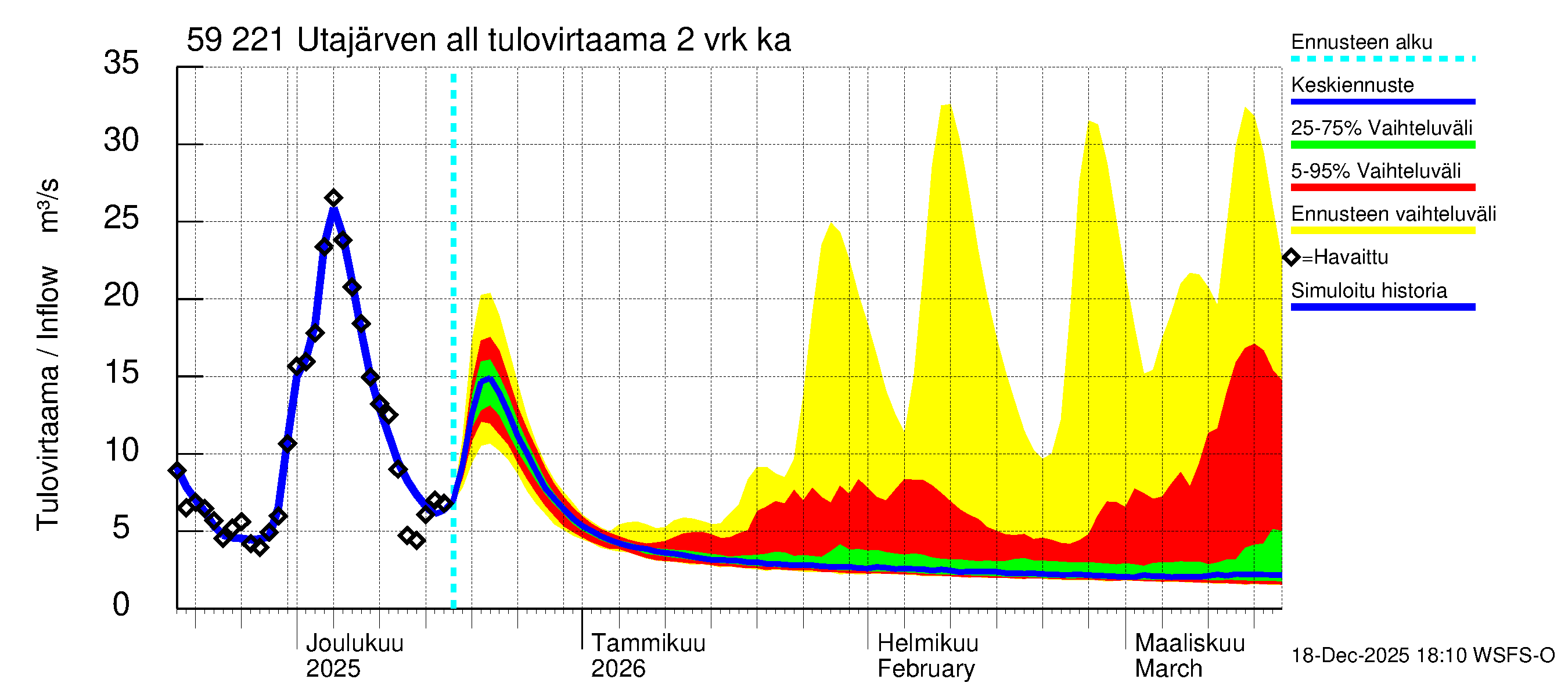 Oulujoen vesistöalue - Utajärven allas: Tulovirtaama (usean vuorokauden liukuva keskiarvo) - jakaumaennuste